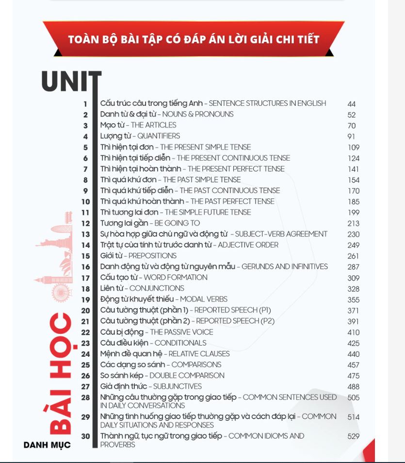 - Sách bao gồm 30 units, trong đó mỗi bài lại được chia thành các phần: Nghe - Nói - Đọc - Viết và Ngữ Pháp.
