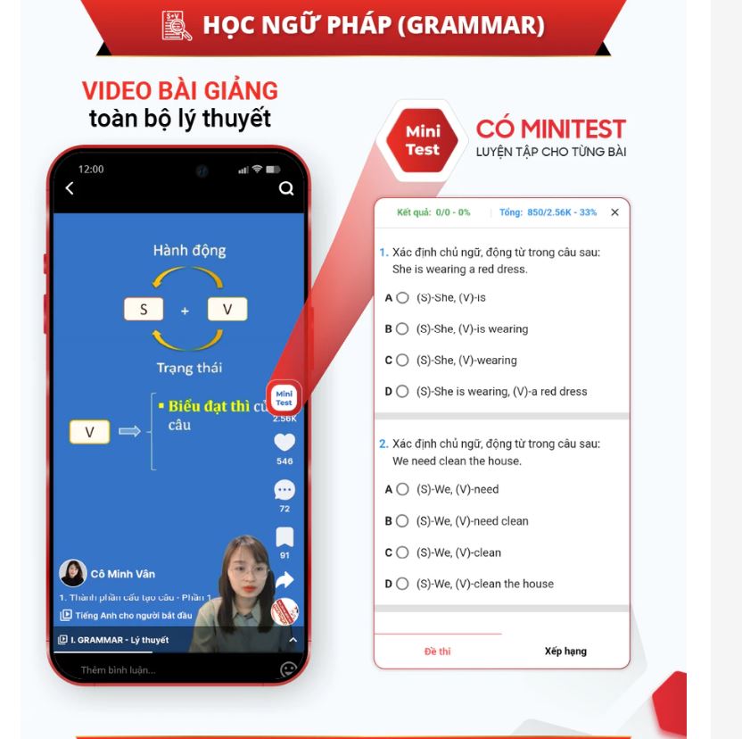 - Phần Grammar: Có video bài giảng các chuyên đề lý thuyết kèm minitest thực hành.