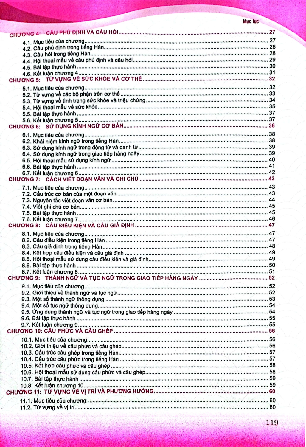 Nội dung sách bao gồm các bài học về ngữ pháp, từ vựng và các mẫu hội thoại thực tế. Từng chương được xây dựng để bạn dần nắm vững các chủ điểm quan trọng như cách sử dụng câu phức, câu điều kiện, kính ngữ, và cách biểu đạt cảm xúc, suy nghĩ trong nhiều bối cảnh khác nhau. Bên cạnh đó, bạn sẽ được tiếp cận với các chủ đề phong phú về văn hóa Hàn Quốc, từ phong tục tập quán, lối sống, cho đến các giá trị truyền thống và hiện đại. Những kiến thức này không chỉ giúp bạn hiểu sâu hơn về ngôn ngữ mà còn kết nối với văn hóa và con người Hàn Quốc một cách chân thực hơn.