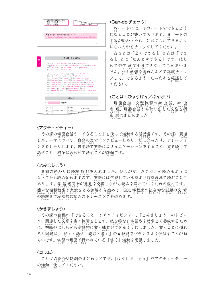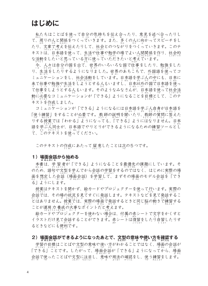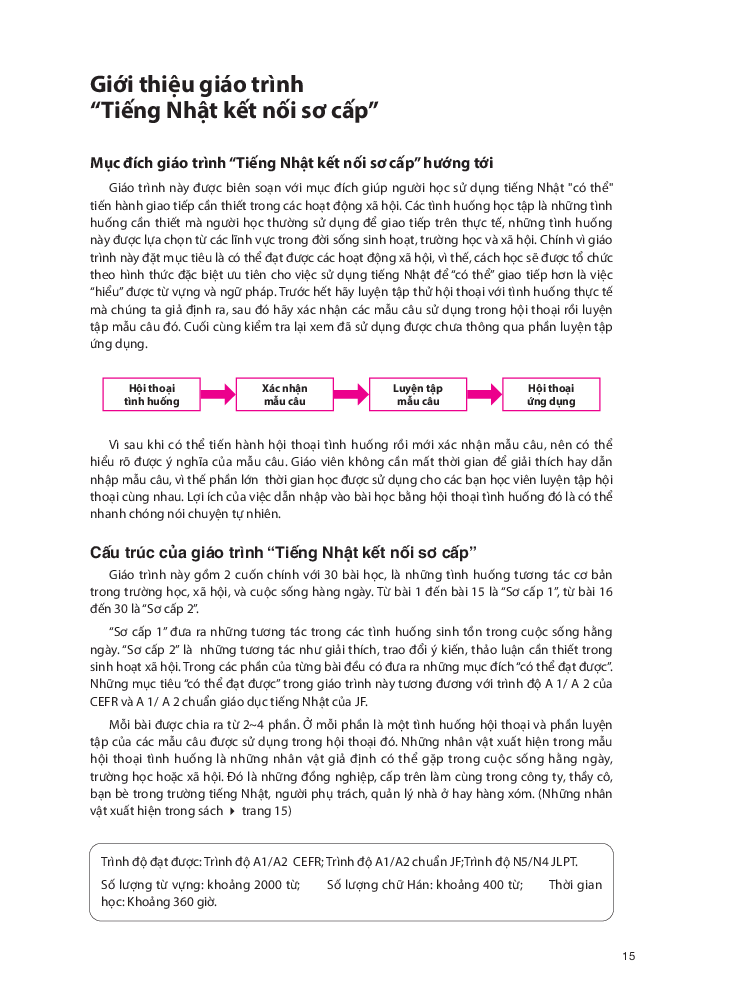 Giáo trình được biên soạn nhằm giúp người học giao tiếp bằng tiếng Nhật tốt hơn trong các hoạt động xã hội. Các tình huống học tập trong giáo trình là những tình huống thường được sử dụng để giao tiếp trên thực tế, được lựa chọn từ các lĩnh vực trong đời sống sinh hoạt, trường học và xã hội. Cách học được tổ chức theo hình thức đặc biệt ưu tiên việc "Giao tiếp" hơn là "Hiểu" từ vựng và ngữ pháp. [Hội thoại tình huống -> Xác nhận mẫu câu -> Luyện tập mẫu câu -> Hội thoại ứng dụng] Giáo trình bao gồm 2 sách giáo khoa sơ cấp 1, 2, hai quyển Work book sơ cấp 1,2 và 1 quyển Bản dịch và giải thích ngữ pháp.