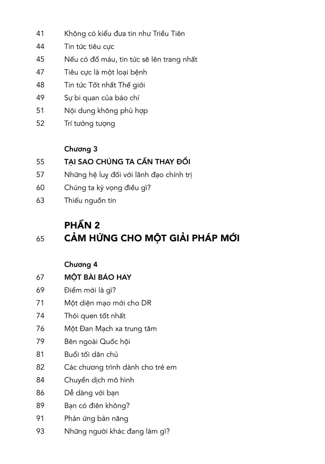 - Đề xuất giải pháp xây dựng một nền báo chí đa chiều, có khả năng truyền cảm hứng tích cực và mang lại nhiều lợi ích toàn cầu hơn. Tác giả đề xuất giải pháp cải thiện tình hình theo hướng tích cực bằng cách thiết lập lại một nền truyền thông trung thực, đa chiều, được xây dựng trên căn bản là "tin tức xây dựng" (constructive news). Cơ chế hoạt động của truyền thông - tin tức toàn cầu đương thời - với nền dân chủ truyền thông phương Tây như một kiểu bài học được mô tả, phân tích bằng những quan sát nghề nghiệp thấu đáo và hàng loạt những dẫn chứng thực tế sinh động. Cuốn sách có ích cho một CÁCH LÀM TRUYỀN THÔNG MỚI, khi truyền thông dễ dàng tràn ngập "tin xấu" (negative) và sự lên ngôi của chủ nghĩa dân tuý (populism) dần dà tạo nên mối hoài nghi ngày càng lớn trong dư luận. Tác giả Ulrik Haagerup nguyên là Giám đốc điều hành của Đài phát thanh – truyền hình Quốc gia Đan Mạch; Fouder và CEO của Viện nghiên cứu Tin tức xây dựng (Constructive Institute) mục tiêu cải thiện văn hóa tin tức toàn cầu.