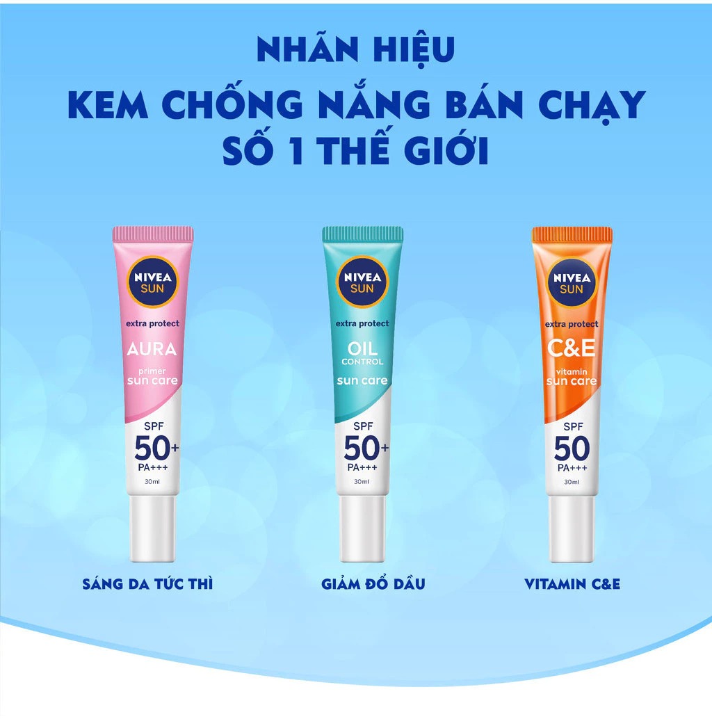 Dưới thời tiết nắng nóng, da mặt bạn thường xuyên đổ dầu khó chịu. Lớp dầu trên mặt không những làm cho lớp kem chống nắng dễ bị trôi đi, mà còn gây tắc lỗ chân lông, là nguyên nhân dẫn đến da bị mụn. Tinh chất chống nắng NIVEA giúp dưỡng trắng và kiểm soát dầu, chứa hoạt chất L-carnitine giúp hạn chế bã nhờn tiết ra đáng kể trên da mặt. Công thức tiên tiến với chỉ số chống nắng SPF50+ PA+++ giúp bảo vệ da tối ưu khỏi tia UVA1, UVA2 và UVB, giúp ngăn ngừa nám, tàn nhang và nếp nhăn do nắng. Đồng thời, với kết cấu dạng tinh chất chứa các hạt phân tử siêu nhỏ, dễ dàng thấm nhanh và sâu vào da*, đem lại cảm giác dịu nhẹ, thoáng mịn không nhờn rít. Đặc biệt, có thể sử dụng như lớp lót trang điểm, mỏng nhẹ tự nhiên và phù hợp với nhiều màu da.
