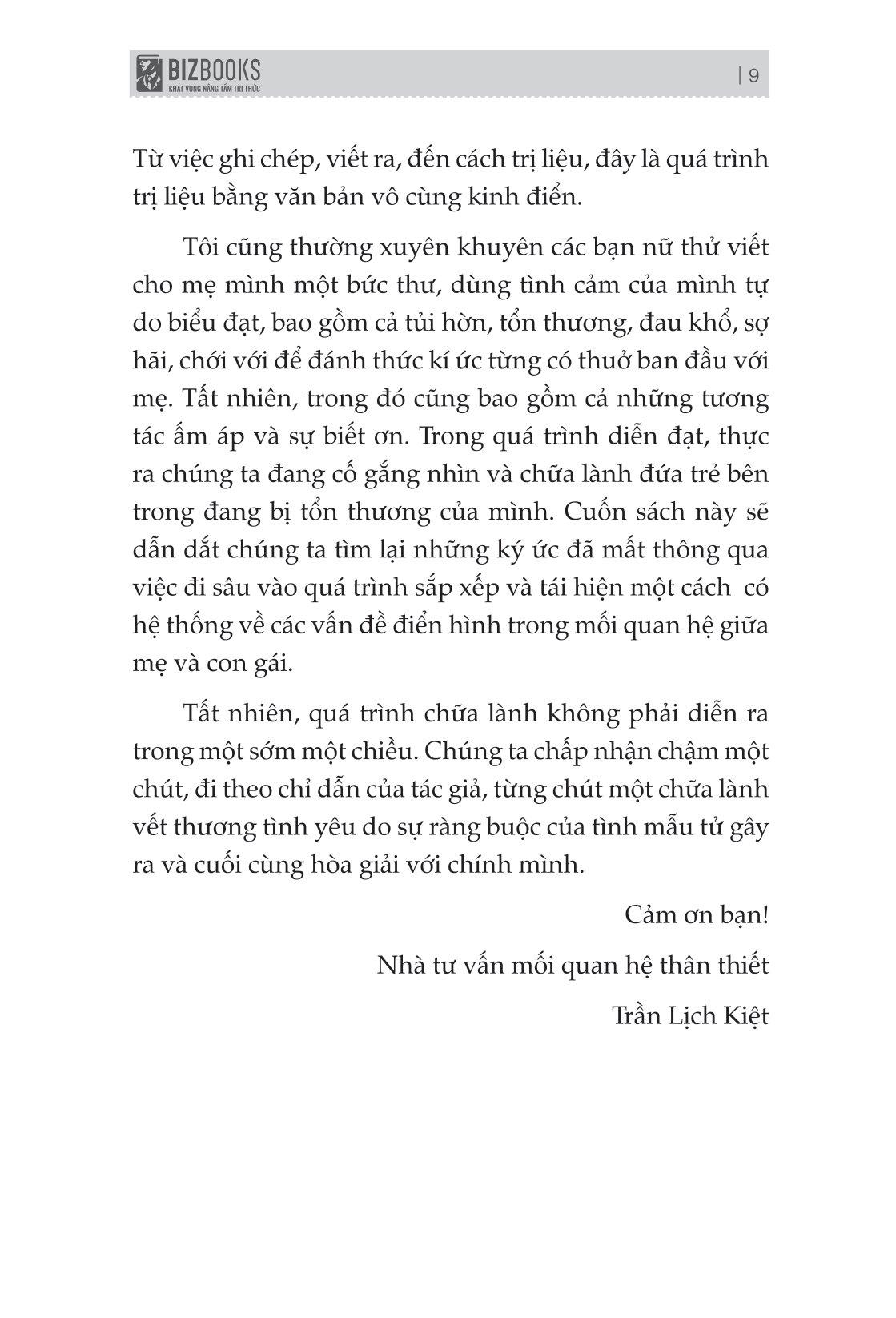 Cuốn sách sẽ dẫn dắt bạn đi tìm lại những ký ức đã mất thông qua việc đi sâu vào quá trình sắp xếp và tái hiện một cách có hệ thống về các vấn đề điển hình trong mối quan hệ giữa mẹ và con gái.
