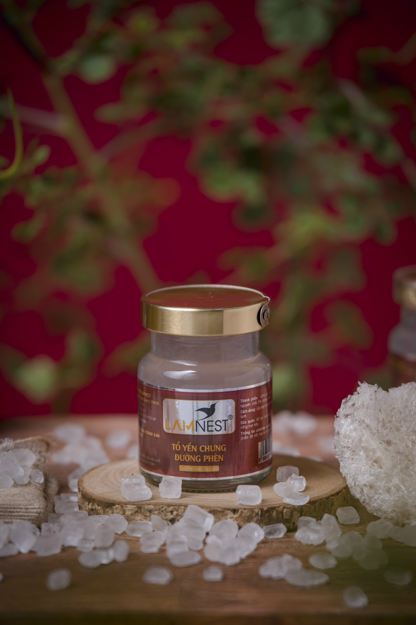 THÀNH PHẦN - 1.5 gram yến sào nguyên chất khô ( tương đương 10 gram yến tươi ) được khai thác tại các nhà yến ven biển. - Đường phèn TTC - Nước Ion kiềm