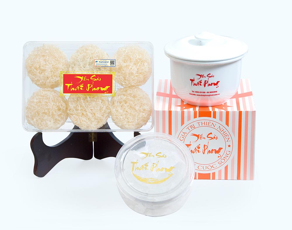 • Ngoài ra tổ yến cũng là thức ăn rất bổ dưỡng, dùng cho các trường hợp cơ thể suy nhược, mệt mỏi, biếng ăn, khí huyết yếu kém, cơ thể nóng do hút thuốc và uống nhiều rượu bia, mất ngủ, tim đập nhanh, gầy yếu, da vàng …. CÁCH DÙNG YẾN SÀO: Yến sào tốt nhất là ăn yến khi bụng rỗng (dùng buổi sáng sớm trước khi ăn sáng nửa giờ) hoặc trước khi đi ngủ vì buổi tối là thời gian dưỡng chất được hấp thụ tốt nhất. Về liều lượng nên ăn hàng ngày hoặc cách ngày đều đặn một lượng yến phù hợp thay vì thỉnh thoảng mới ăn một lượng yến lớn. HƯỚNG DẪN CHẾ BIẾN YẾN SÀO: Để chế biến tổ yến tinh chế, ta ngâm tổ yến vào nước khoảng 30 phút cho nở hoàn toàn, để ráo, đem tiềm (chưng cách thủy) 30 phút sau đó bỏ đường phèn chưng 10 phút. Hoặc tổ yến chưng cùng lúc với các thực phẩm khác (táo đỏ, hạt sen, nhãn nhục, kỷ tử, hạt chia, trái cây tươi,). Nên sử dụng mỗi tuần 10gr là đủ. Cách đơn giản nhất là chưng với đường phèn. Bạn chưng cách thủy một lần 10gr, chia làm ba phần, ăn một phần rồi để trong tủ lạnh, cách ngày ăn một lần. TỔ YẾN SÀO THÁI PHONG Chúng tôi tuyệt đối không mua bán Tổ Yến Sào không rõ nguồn gốc ảnh hưởng đến sức khỏe của quý khách hàng. Sản Phẩm Tổ Yến Sào tại Thái Phong có Giấy phép đăng ký kinh doanh Tổ Yến Yào, Giấy Chứng nhận Vệ Sinh An Toàn Thực Phẩm về tổ yến, có tem chống hàng giả trên mỗi sản phẩm. Công ty Thái Phong cam kết đền bù 100% giá trị sản phẩm nếu sản phẩm Công ty chúng tôi cung cấp cho quý khách không phải là thật.