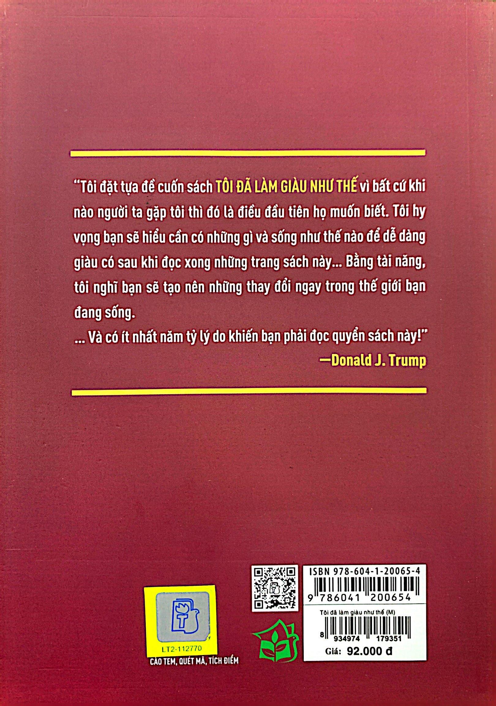Phương châm của Donald là: “Nếu bạn không nói cho mọi người biết về sự thành công của bạn thì người ta sẽ không hề biết gì về nó đâu”, chính vì vậy cuốn sách Tôi đã làm giàu như thế ra đời, chỉ vì theo chính lời tác giả: “Có ít nhất năm tỉ lý do khiến bạn phải đọc quyển sách này”. Vắn tắt, nhanh gọn và trực tiếp, những câu chuyện và những lời khôn ngoan được chắt lọc trong suốt ba mươi năm của người luôn đứng đầu của sự thành công sẽ cho bạn những lời khuyên sâu sắc.