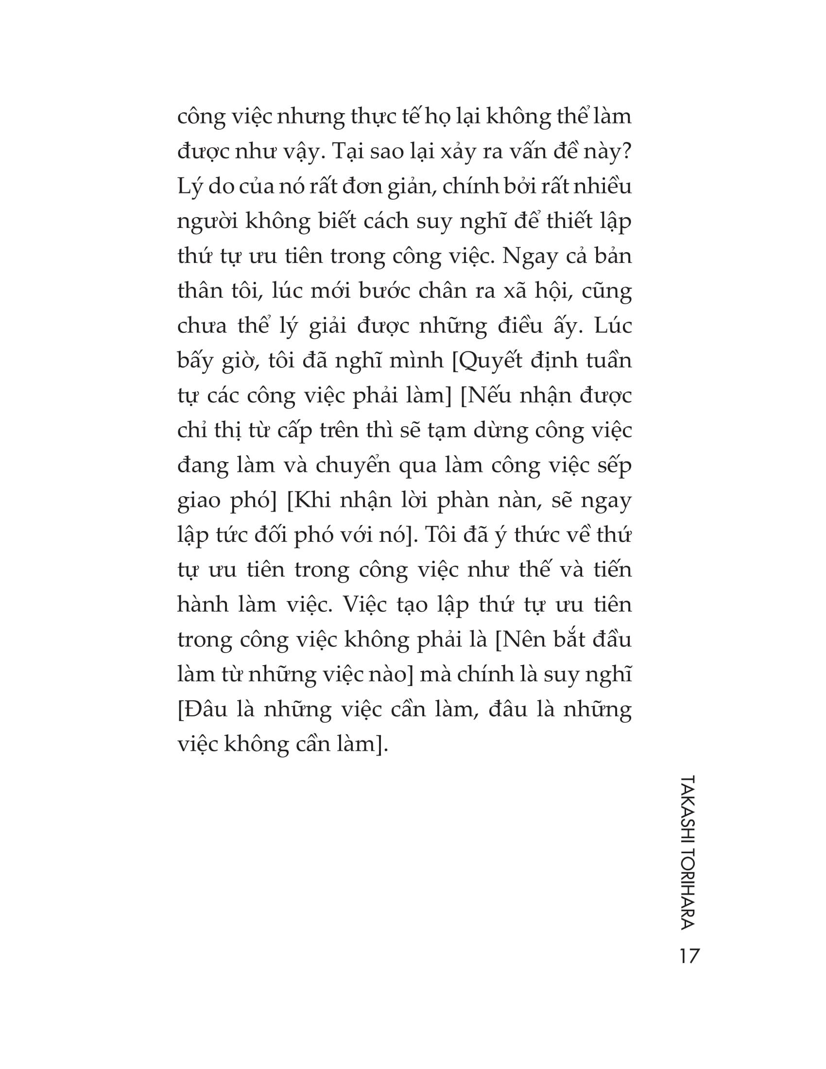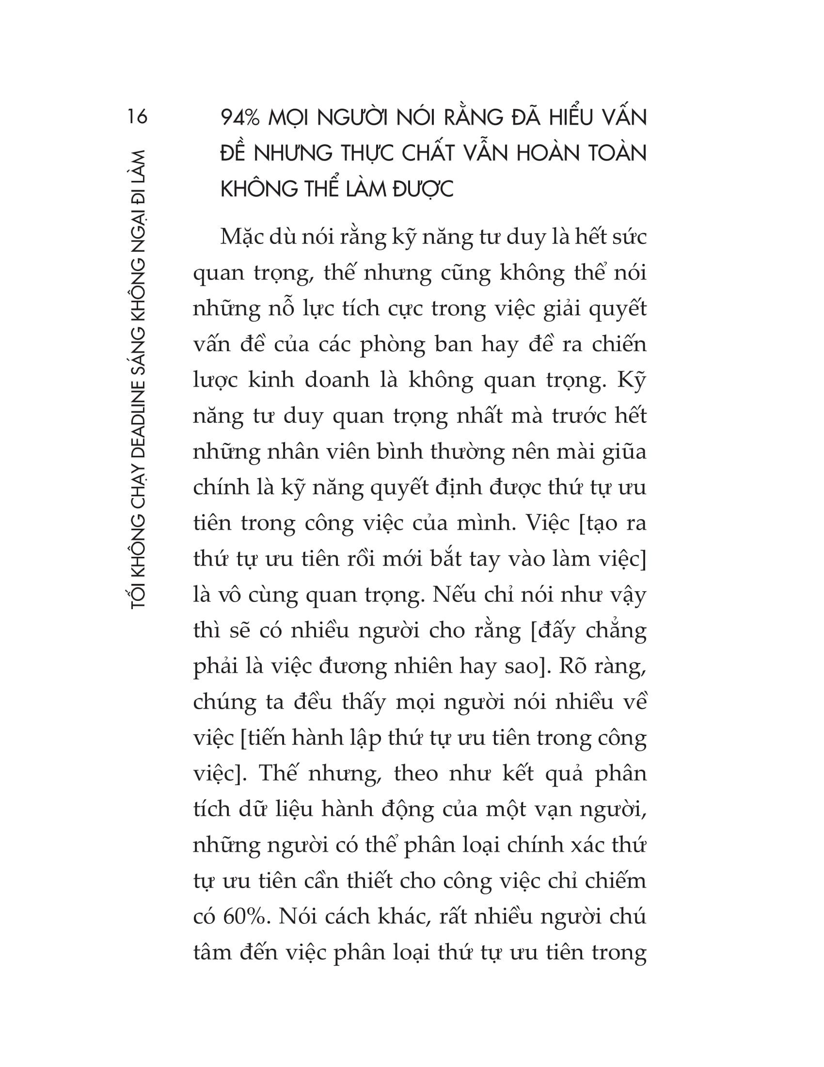 - Biết giao tiếp chuyên nghiệp để phục vụ công việc Cuốn sách này sẽ giúp mỗi chúng ta nâng cao cả chất lượng công việc lẫn tốc độ làm việc, thông qua việc vận hành cơ chế tư duy nhằm làm việc đạt hiệu quả cao trong thời gian ngắn. Thông qua việc giới thiệu 33 thói quen trong công việc, cuốn sách giúp bạn dễ dàng hiểu và áp dụng những phương quản lý công việc, khiến bạn trở thành một trong những nhân viên ưu tú nhất, luôn được cấp trên và đồng nghiệp tin cậy.