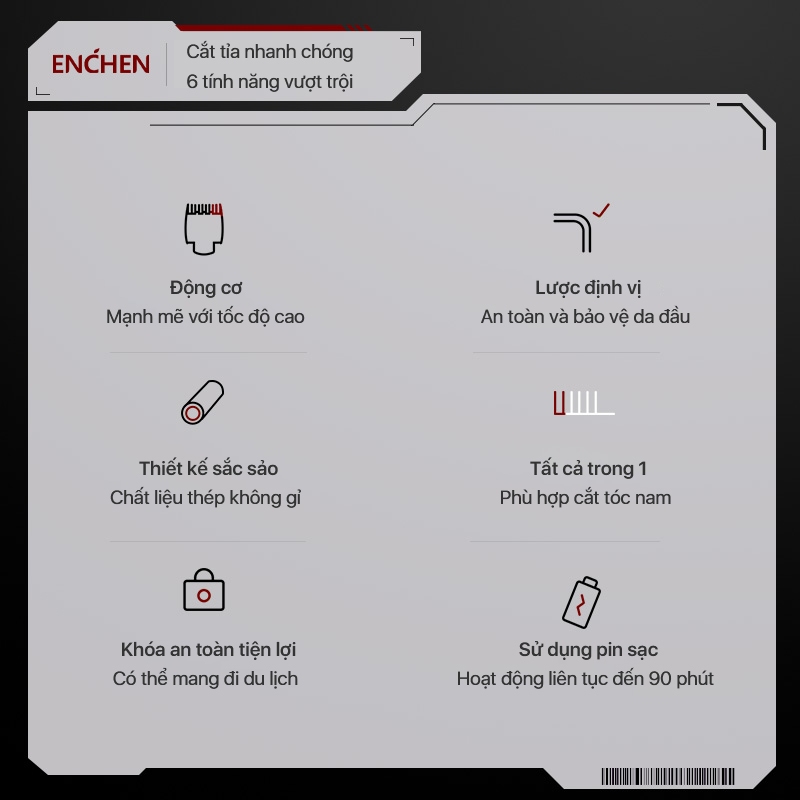 Tông đơ cắt tóc đa chức năng Enchen Beardo 2 chất liệu thép không gỉ nhiều cữ linh hoạt • Thương hiệu: Enchen • Model: Beardo2 • Màu sắc: Đen • Điện áp định mức: 5V • Công suất định mức: 5W • Pin Lithium: 800mAh • Thời gian sạc: 2.5-3h • Kích thước sản phẩm:140 x 32mm • 1 Hộp sản phẩm gồm: 1 tông đơ cắt tóc,1 dây sạc điện, 1 chổi vệ sinh tặng kèm 4 cữ căn chỉnh tóc   ĐẶC ĐIỂM NỔI BẬT CỦA SẢN PHẨM: • Thiết kế nhỏ gọn dễ cầm nắm thao tác • Đầu cắt tiện lợi dễ dàng thao tác, lưỡi cắt tiện lợi được đưa lên phía trước dễ tạo kiểu hơn • Động cơ mạnh mẽ với tốc độ cao, độ ồn thấp không làm các bé sợ hãi • Lưỡi an toàn: Làm bằng thép không gỉ ceramic độ cứng cao, chống mài mòn tốt • Lưỡi cắt sắc bén, thời gian pin dài: Lưỡi cắt của Tông đơ cắt tóc sử dụng vật liệu độ cứng cao, chống mòn cực kì tốt. Hơn nữa đầu cắt cũng cho độ sắc bén nhất định, giúp các đường cắt được nhanh gọn và linh hoạt hơn • Dễ dàng căn chỉnh không gây ảnh hưởng da đầu