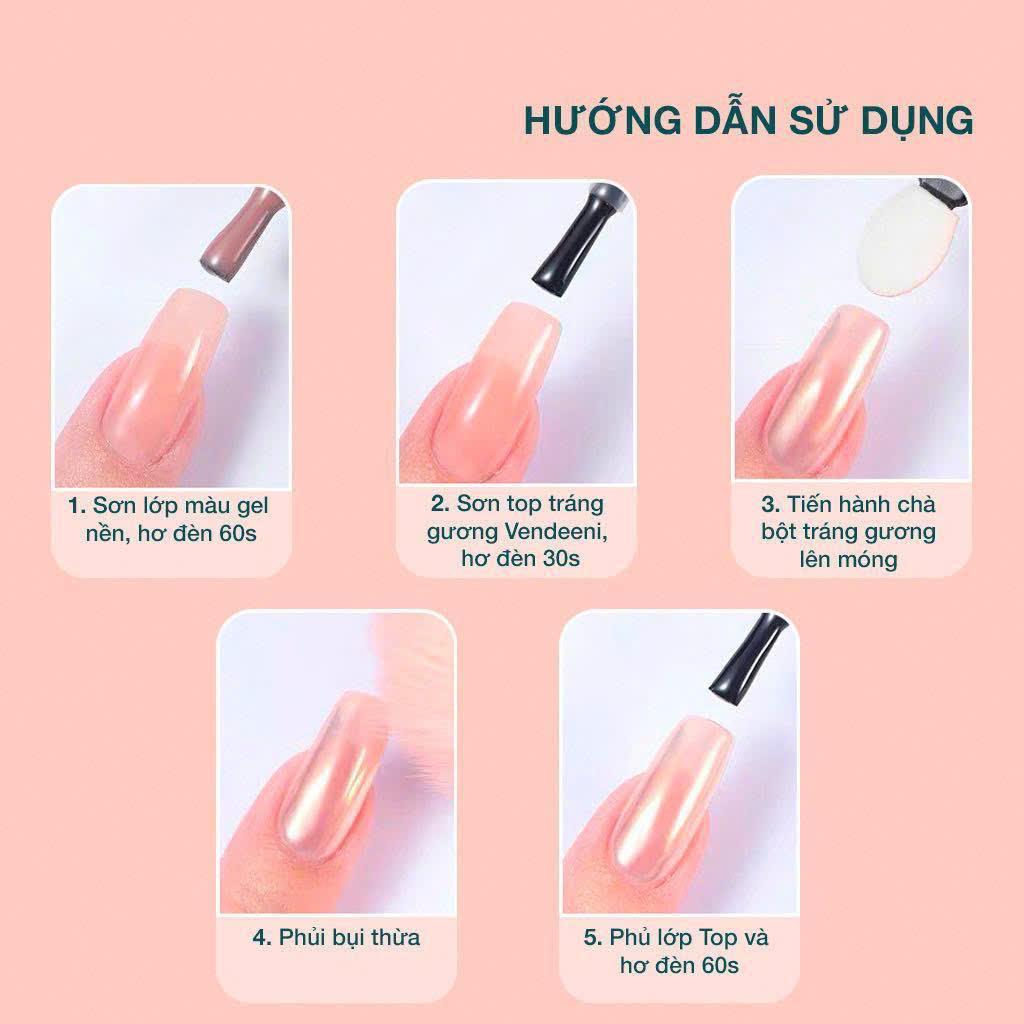 - Cách Sử Dụng: Bước 1: Chuẩn bị móngLàm sạch và tạo form móng theo ý muốnSơn lớp base coat và màu nền (nếu cần)Bước 2: Tráng gươngSơn một lớp mỏng top coat chuyên dụng lên móngNhanh chóng phủ bột tráng gương lên bề mặt còn ướtDùng dụng cụ chà nhẹ nhàng để tạo hiệu ứng gươngBước 3: Hoàn thiệnPhủ thêm một lớp top coat chuyên dụng để seal bộtSấy khô dưới đèn UV/LEDLặp lại quá trình nếu muốn hiệu ứng đậm hơn