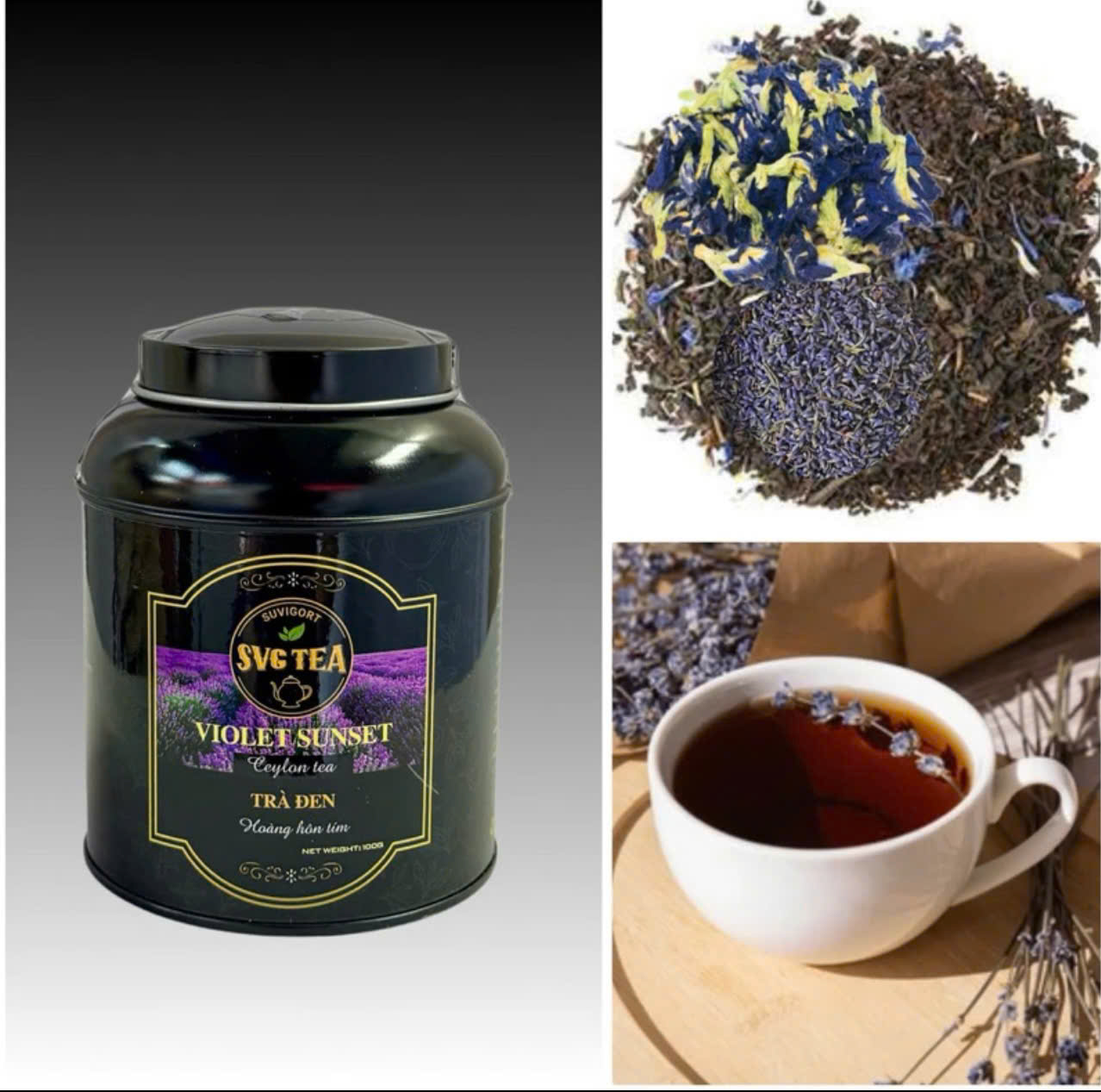 Violet Sunset Black Tea là loại trà đen Ceylon kết hợp tinh tế với hoa oải hương, hoa đậu biếc và lá bạc hà sấy tinh khiết mang đến hương vị the mát, thơm quý