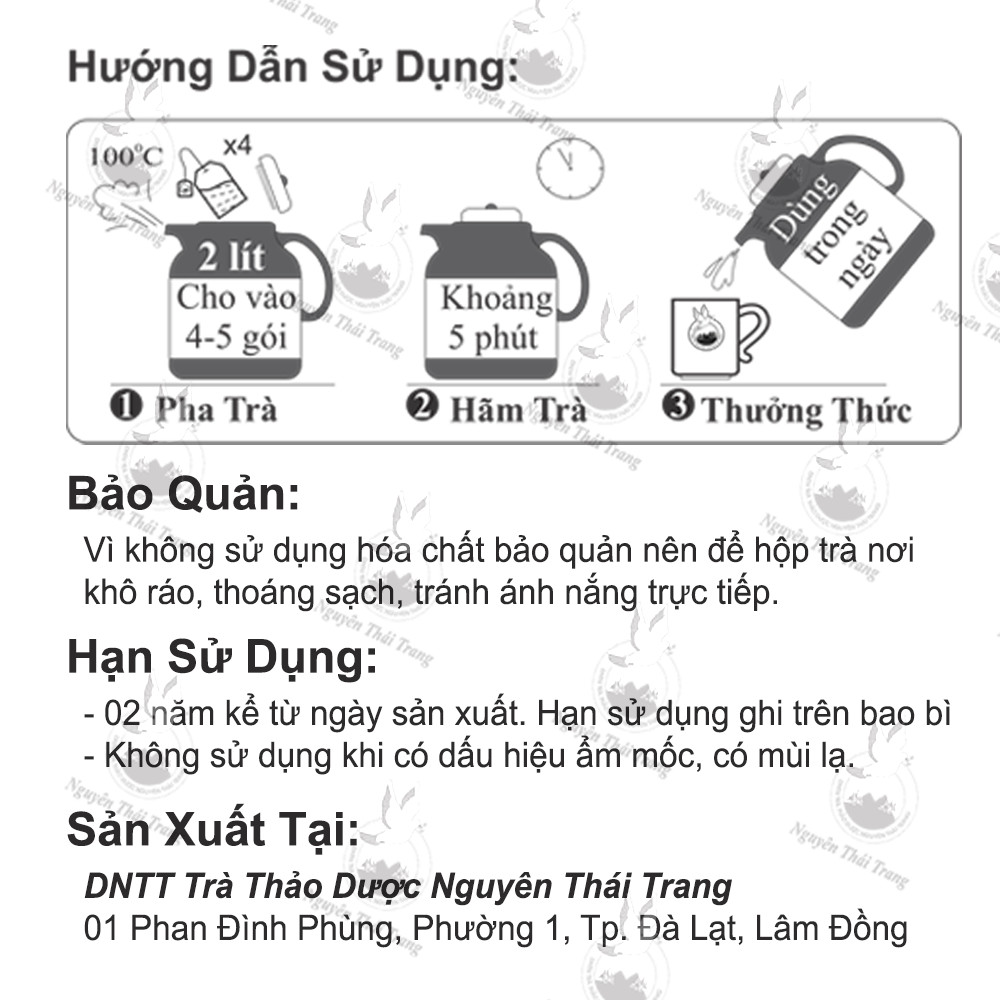 - Lưu Ý: Sản Phẩm khi dùng sẽ có chút “ bột thuốc” trong nước. Do trà được sản xuất từ các loại thảo dược trong đó nhiều vị thuốc khi bào chế sẽ tạo thành bột mịn, loại bỏ sẽ làm giảm tác dụng của trà. Sau khi hãm, Bạn có thể để lắng hoặc lọc bỏ cặn sau đó dùng.