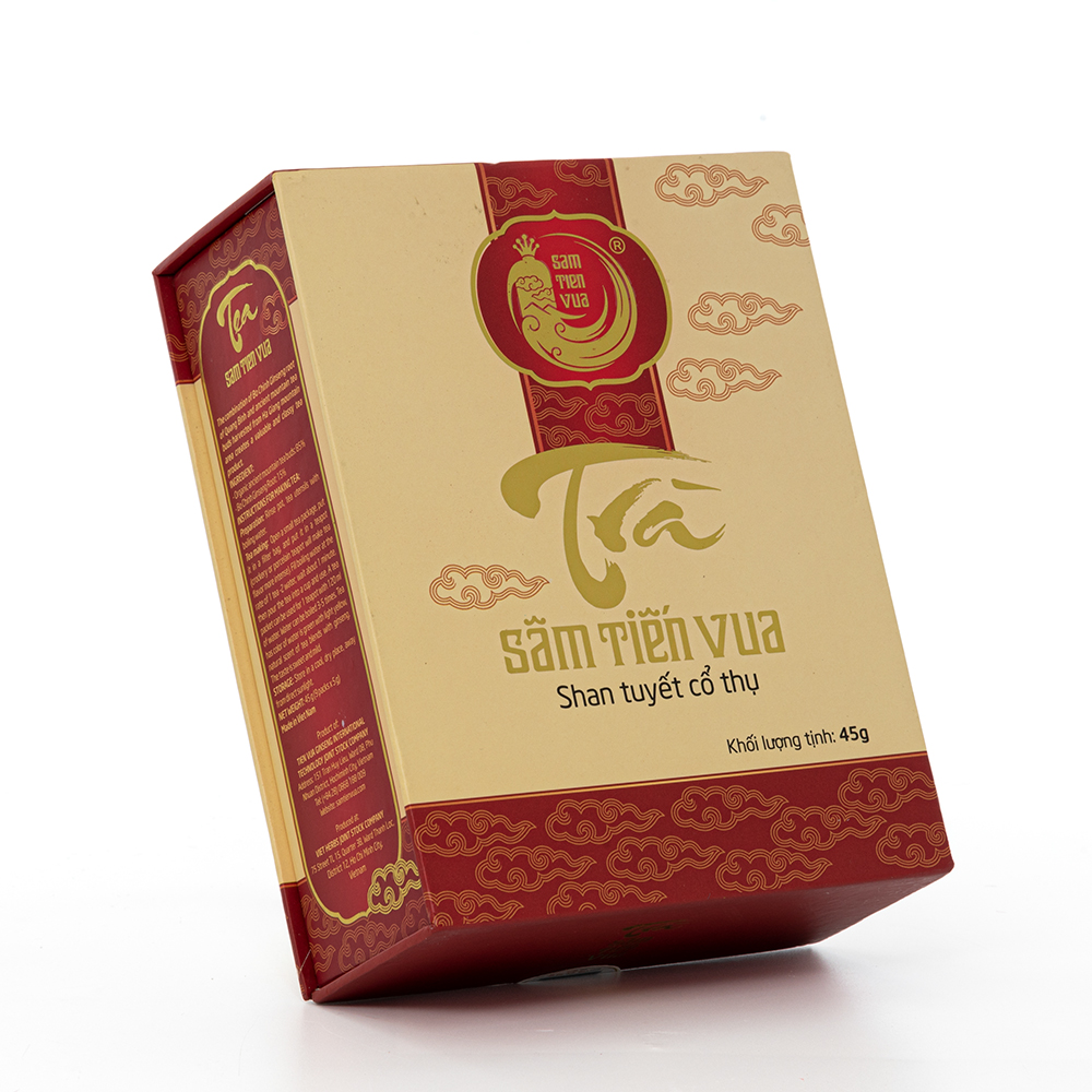 - THÔNG TIN SẢN PHẨM Tên sản phẩm: Trà sâm Tiến Vua shan tuyết cổ thụ Sản xuất tại: Việt Nam Dạng sâm: Khô Đóng gói: