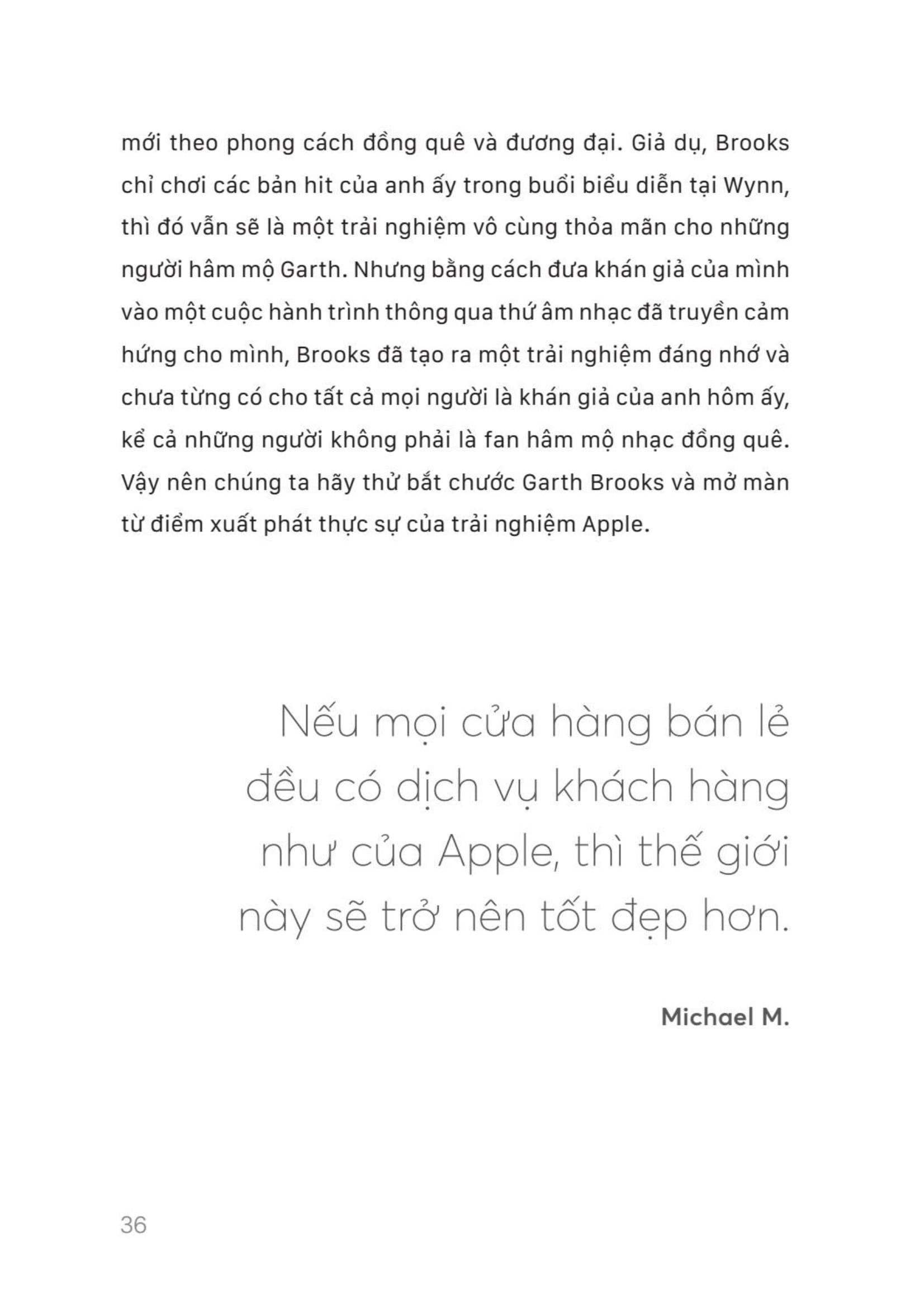 Sang trọng, đẳng cấp – hẳn nhiên là từ khóa ta thường gán cho Apple. Nhưng những thứ đó không thể tạo ra được những trải nghiệm đáng nhớ, sự yêu mến hay lòng trung thành của một khách hàng trọn đời. Ngoài sản phẩm, bạn và toàn bộ đội ngũ của mình mới là yếu tố tạo nên một “văn hóa phục vụ khách hàng” trong mọi điểm chạm. Đó là điều mà tác giả Gallo đã chứng minh rằng nếu nắm được tư duy và có một hệ thống, thì mọi thương hiệu đều có thể học và làm theo như Apple.