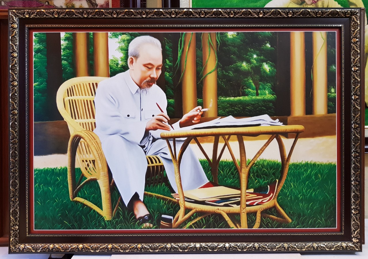 ✨TRANH IN DẦU -BÁC HỒ NGỒI VIẾT DI CHÚC TRONG VƯỜN HOA PHỦ CHỦ TỊCH