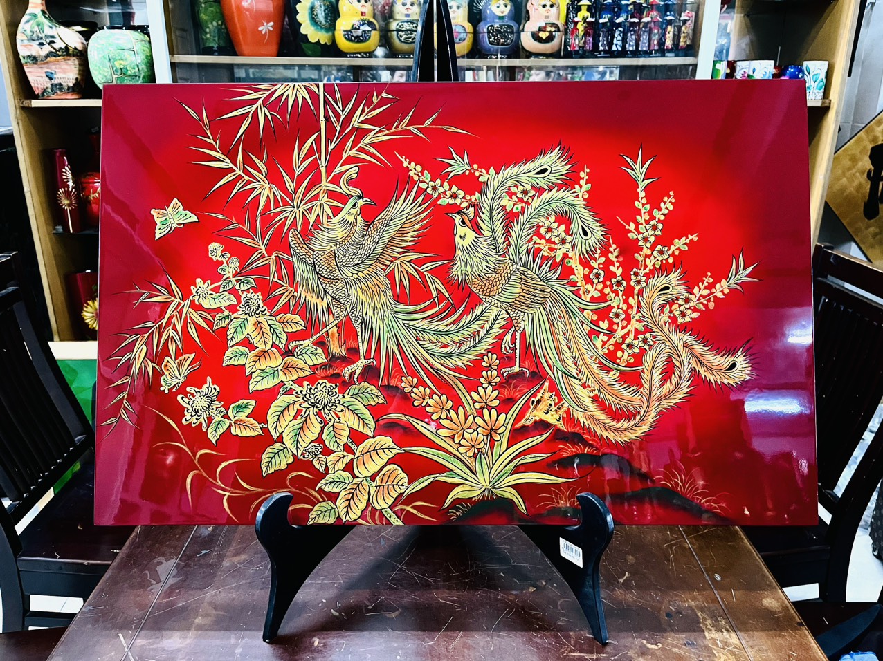 Kỹ thuật đắp nổi trong tranh sơn mài giúp tạo chiều sâu và sự sống động cho hình ảnh, khiến đôi chim phượng hoàng như đang bay lượn, tỏa sáng giữa các họa tiết phong phú và màu sắc rực rỡ. Hướng dẫn bảo quản: Tránh ánh nắng trực tiếp và nhiệt độ cực nóng. Giữ đồ Sơn Mài của bạn trong môi trường cân bằng (trung bình: 60% độ ẩm)