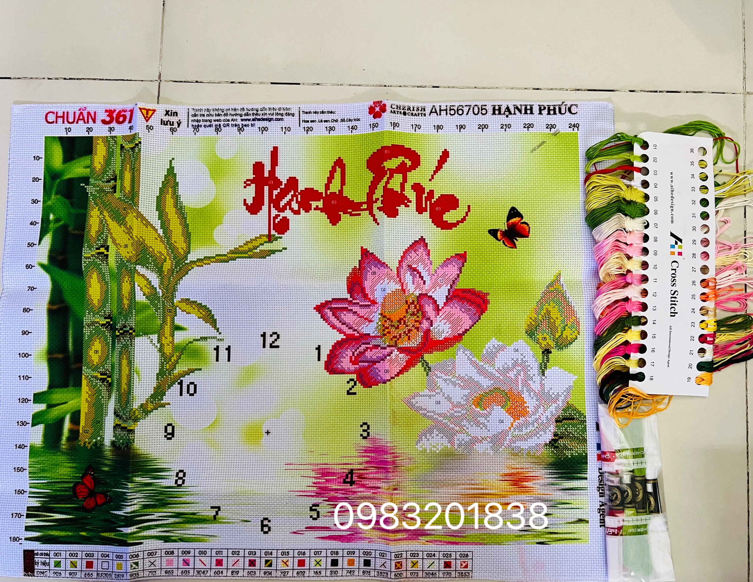 Tên tranh: Tranh thêu chữ thập Đồng hồ Hạnh phúc AL56705Thể loại: Tranh thêu chữ thập (sản phẩm này là tranh chưa thêu).Kích thước: 66 x 52 cm.Phần khách cần thêu trên tranh: Hoa sen, lá sen,chữ, s...