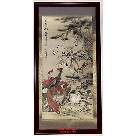 Tranh gốm sứ Bát Tràng cao cấp Hoạ tiết cổ đồ sinh phú quý Nền mành khung gỗ thông Kích thước 43*87cm