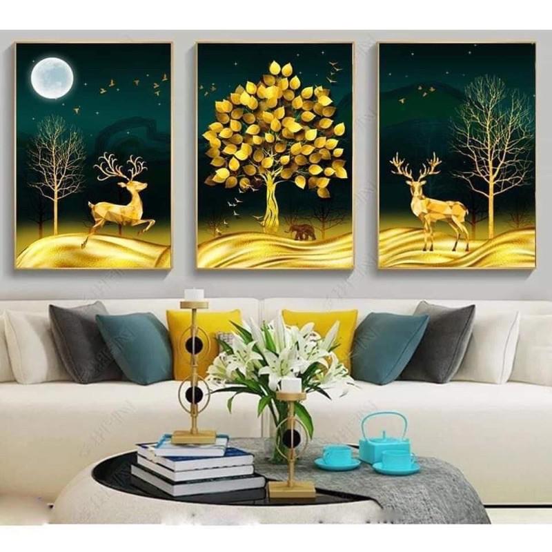 Tranh treo tường trang trí hươu nghệ thuật - Kích thước của tranh : Size 1 :50x70cmx 1 tấm +30x50x2 tấm Size 2 :60x80cm x 1 tấm +40x60x2 tấm - Chất liệu : Tráng gương