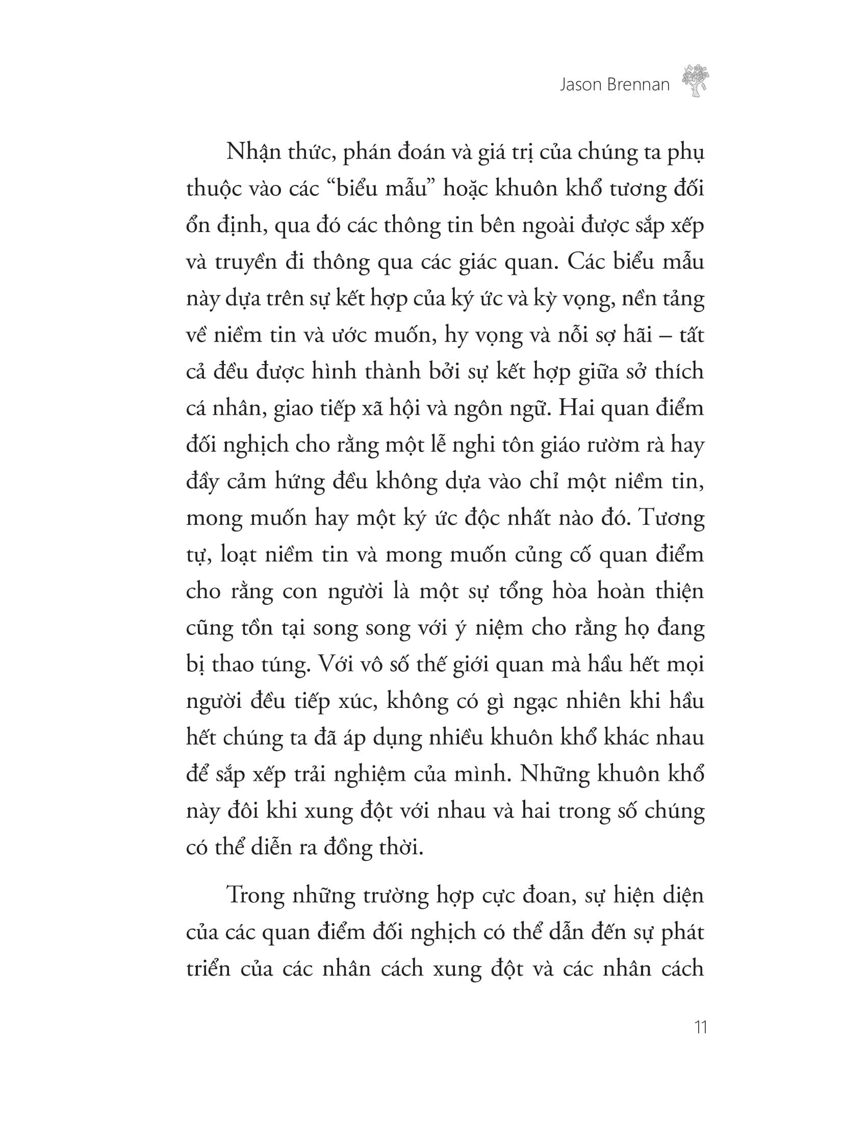 Hầu hết chúng ta trải nghiệm thế giới thông qua các quan điểm đối nghịch. Một công việc hay một tôn giáo có thể quan trọng và hoàn hảo khi nhìn theo một khía cạnh nào đó, nhưng ở một khía cạnh khác, nó thật tẻ nhạt hoặc nực cười. Một người bạn có thể ngốc ngếch ở góc nhìn này, nhưng lại thông minh dưới góc nhìn khác. Việc hai quan điểm cùng tồn tại một lúc có thể là điều đáng lo ngại, nó dấy lên mâu thuẫn trong việc đánh giá các giá trị và làm giảm khả năng sống có mục đích và hiệu quả của chúng ta. Tuy nhiên, như Jennifer Church lập luận trong cuốn sách này, xung đột nội tâm có thể là một điều tốt, và nó không chỉ là một ngã rẽ tạm thời trên con đường đến với giải pháp. Cuốn sách này mô tả một vài kiểu mẫu của “lý trí kép” và giải thích tại sao cũng như làm thế nào để trạng thái này được duy trì. Church xem xét kỹ lưỡng một số ý tưởng phổ biến về bản sắc, bao gồm niềm tin cho rằng cuộc sống của chúng ta nên “có ý nghĩa” như một câu chuyện. Bà cũng xem xét tính hữu ích của lòng thấu cảm đối với ý thức kép, và các hình thức mỉa mai châm biếm và tiếng cười giúp chúng ta hưởng lợi ra sao từ việc giữ vững các quan điểm đối lập. Cuối cùng, Church mở ra tia hy vọng khi gợi ý chúng ta nên biết chấp nhận thực tế trong khi thi thoảng cũng nên được dẫn dắt bởi trí tưởng tượng. Cuốn sách “Triết lý của người hai mặt” - Đối thoại hài hước với người hai mặt về tâm lý mâu thuẫn dành cho bất kỳ ai có hai quan điểm đối lập cùng lúc, cũng có thể nói rằng, đây là cuốn sách dành cho tất cả mọi người. =>> Các lập luận chính trong cuốn sách: Lập luận chống lại một ý tưởng triết học lâu đời cho rằng: cần phải giải quyết những xung đột nội tâm vì chúng là hậu quả của sự đối nghịch trong hệ thống niềm tin. Xem xét vai trò của lòng thấu cảm và tình bạn trong việc duy trì một hình thức ý thức kép có giá trị Nhìn nhận mỉa mai và tiếng cười cho phép chúng ta thực hiện công việc của mình trong khi nhận thức được ý nghĩa tầm thường cuối cùng của chúng. Cho thấy những tưởng tượng mâu thuẫn với niềm tin có thể đóng một vai trò tích cực trong cách chúng ta sống. Thông tin tác giả: Jennifer Church là Giáo sư Danh dự Triết học tại trường đại học Vassar College ở Poughkeepsie, New York. Các nghiên cứu của bà trải dài ở nhiều chủ đề thuộc triết học nhận thức, bao gồm ý thức, tình cảm, phi lí trí, năng lực tri giác và tưởng tượng. Ngoài ra, bà cũng tìm hiểu về Kant, Freud, lí thuyết nữ quyền và triết học về âm nhạc.