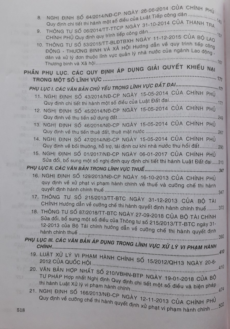 Ngoài ra cuốn sách còn in Luật Khiếu nại 2011, Luật Tiếp công dân và các văn bản hướng dẫn thi hành mới nhất, cùng nhiều văn bản liên quan về các lĩnh vực đất đai, thuế, xử lý vi phạm hành chính cần thiết cho việc giải quyết khiếu nại, giúp cho việc tìm hiểu, tra cứu và áp dụng thuận tiện.