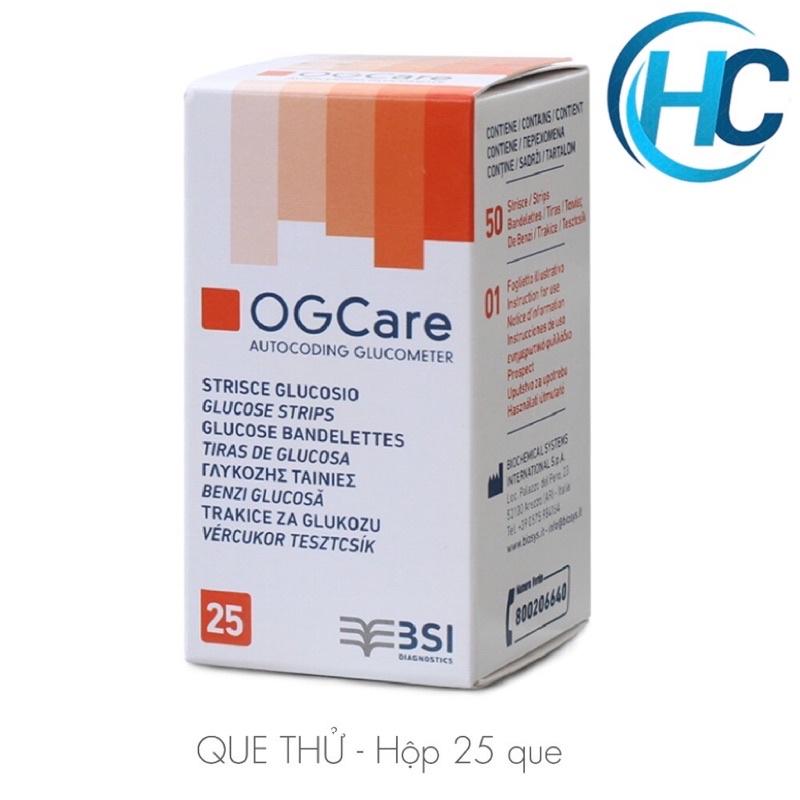 - Que Thử Đường Huyết Ogcare (25 Que/ Hộp) là sản phẩm que thử dùng cho dòng máy đo đường huyết Ogcare của Ý có bán ở hầu khắp các cửa hàng dụng cụ y khoa