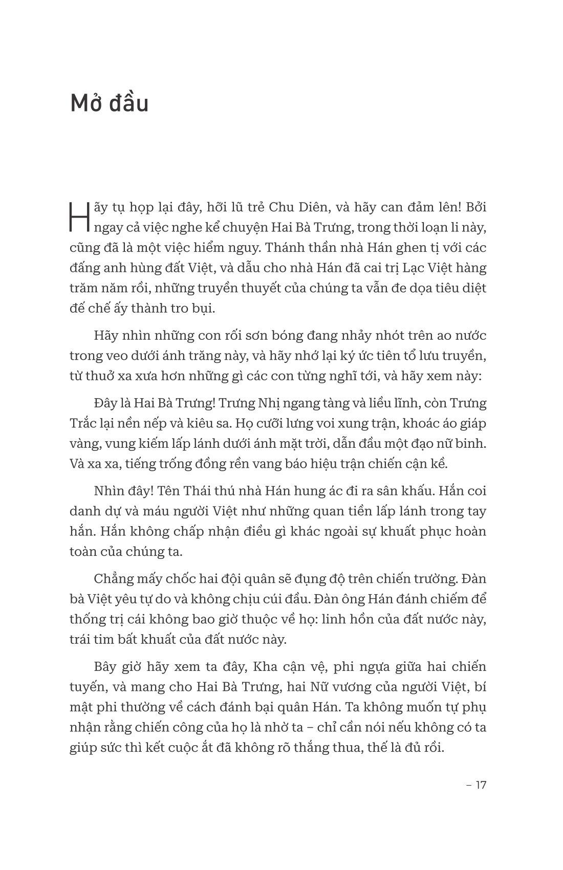 Với văn phong và lối diễn đạt gần gũi, ngôn ngữ của người Việt xưa nhưng vẫn xen lẫn tinh thần hiện đại thông qua cách xây dựng cá tính nhân vật, mối quan hệ tình yêu, gia đình xoay quanh Hai Bà Trưng của tác giả Phong Nguyen - Giáo sư văn học tại Mỹ; đồng thời được chuyển ngữ mượt mà bởi dịch giả nổi tiếng với các tác phẩm văn học kinh điển - Đăng Thư; cuốn sách chắc chắn sẽ gây hứng thú với các độc giả yêu lịch sử, văn học, các nhà văn, nhà phê bình văn học hay nhà nghiên cứu lịch sử.