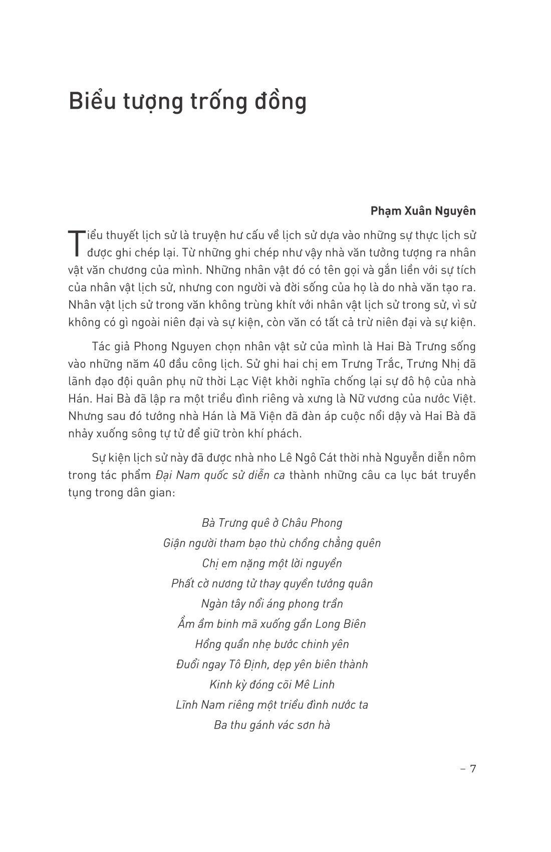 “Tiểu thuyết lịch sử là truyện hư cấu về lịch sử dựa vào những sự thực lịch sử được ghi chép lại. Từ những ghi chép như vậy nhà văn tưởng tượng ra nhân vật văn chương của m.ình… Tác giả Phong Nguyen chọn nhân vật sử của m.ình là Hai Bà Trưng sống vào những năm 40 đầu công lịch.” (Nhà phê bình Phạm Xuân Nguyên).