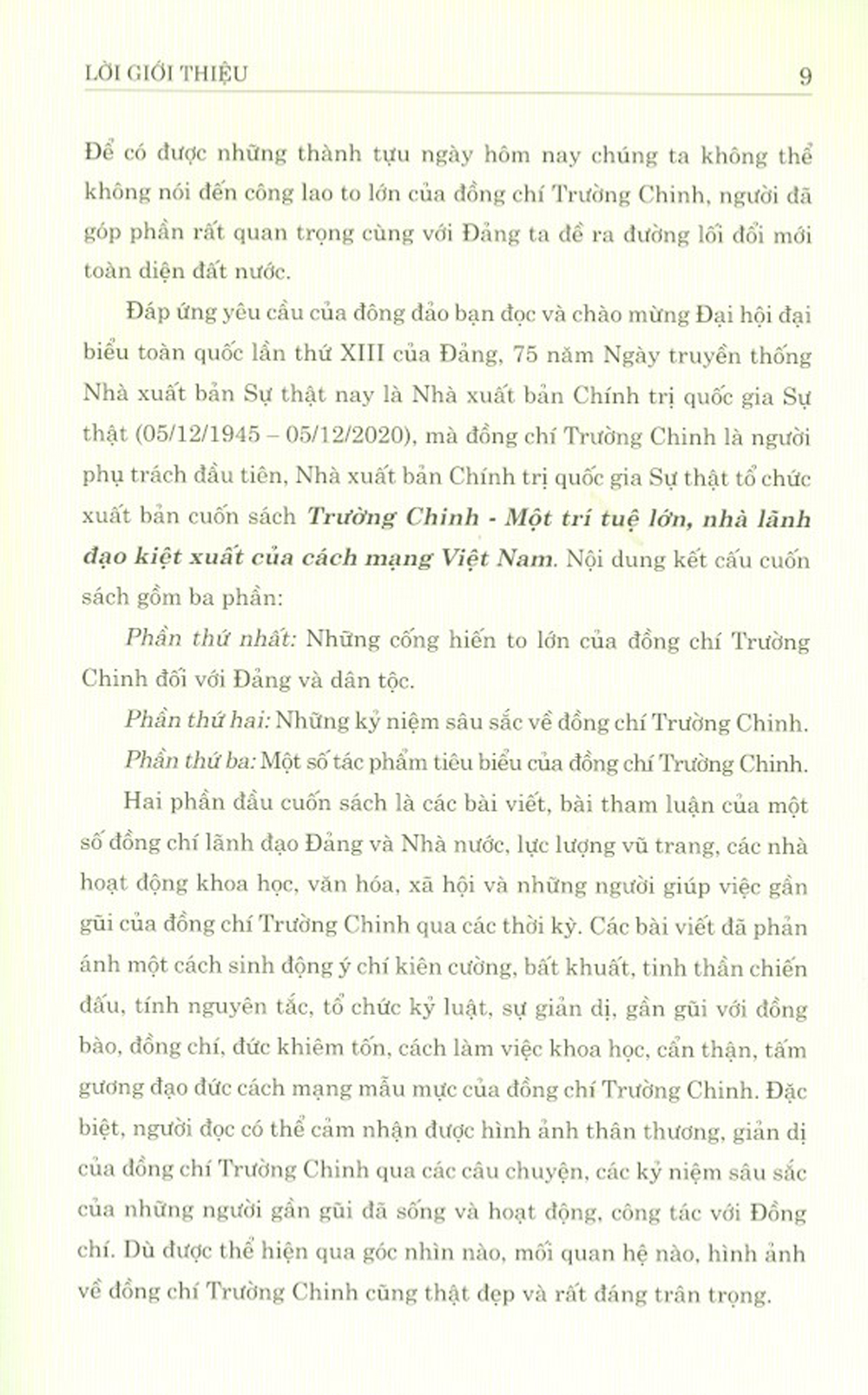 Sách tập hợp các bài viết của các đồng chí lãnh đạo Đảng và Nhà nước, các nhà hoạt động khoa học, văn hóa, xã hội và những người làm việc gần gũi với đồng chí Trường Chinh qua các thời kỳ về những cống hiến to lớn của đồng chí Trường Chinh đối với Đảng và dân tộc; những kỷ niệm sâu sắc về đồng chí Trường Chinh; một số tác phẩm tiêu biểu của đồng chí.