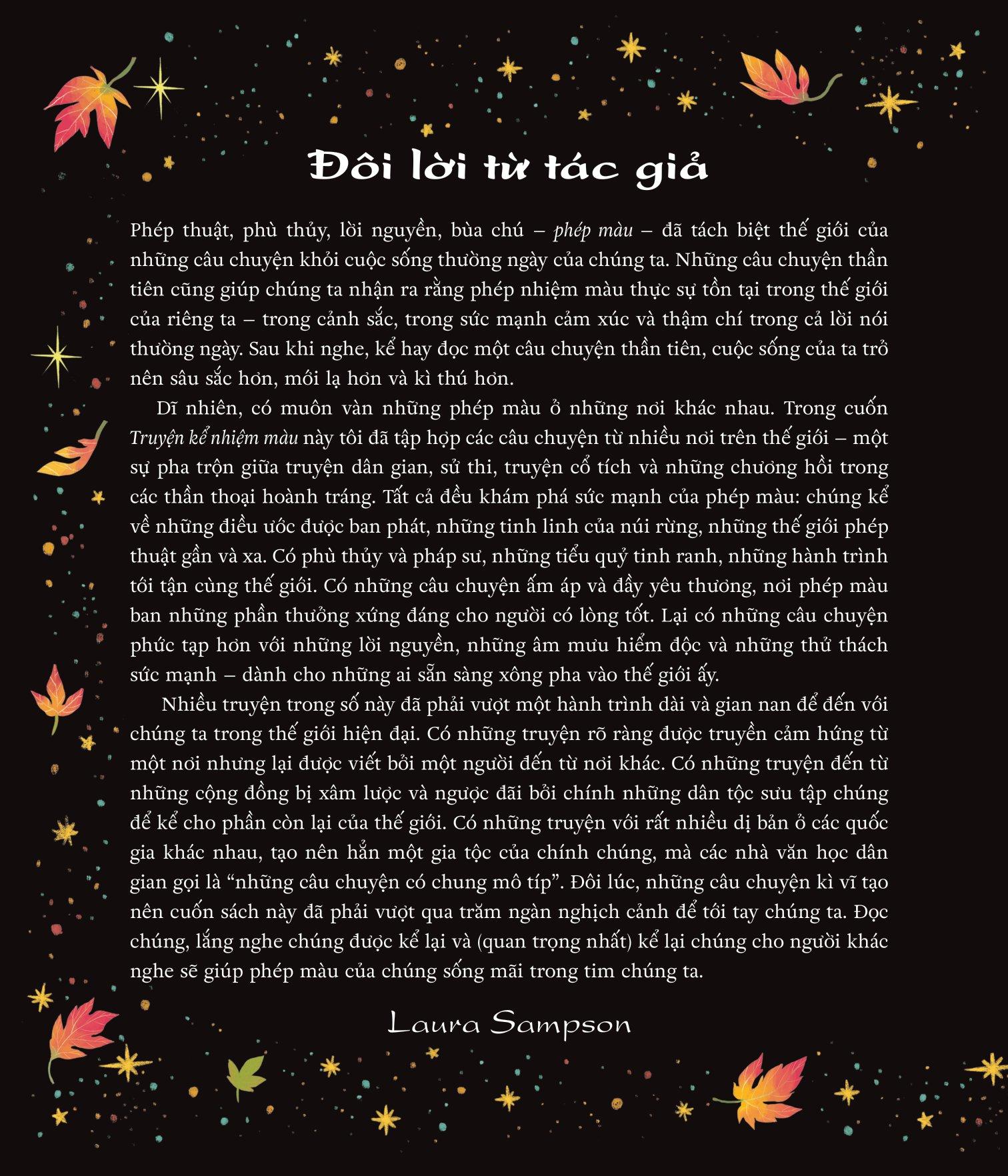 Tuyển tập truyện minh họa tuyệt đẹp này gồm những câu chuyện thần tiên trên khắp thế giới – từ Bắc và Nam Mĩ, châu Âu, châu Phi, châu Á và châu Đại Dương. Được kể lại bởi Laura Sampson với những tác phẩm minh họa cuốn hút của hai họa sĩ Việt Nam - Quang và Liên, đây chính là cuốn sách nhiệm màu đáng được nâng niu bởi nhiều thế hệ.