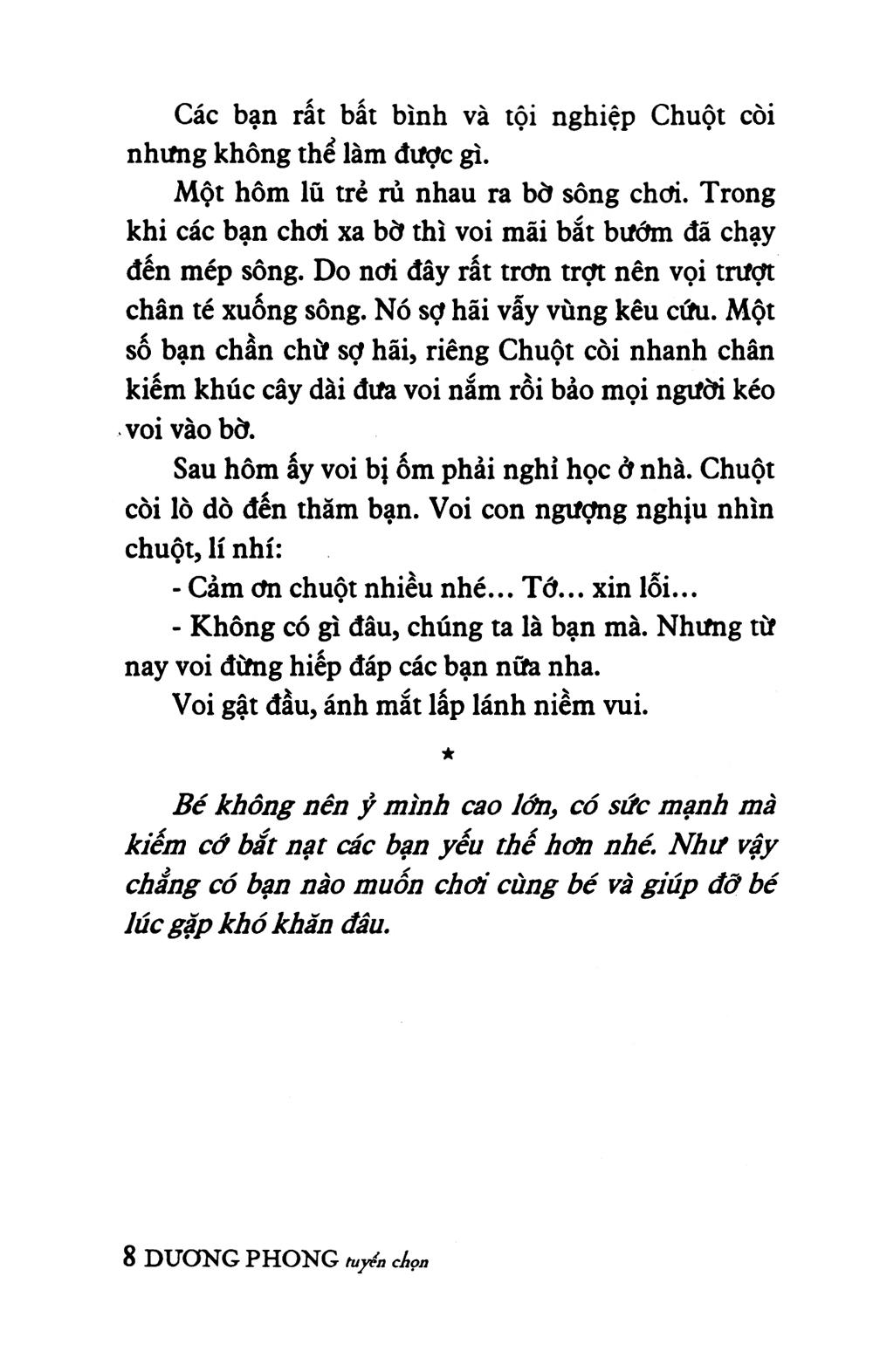 Những mẩu chuyện trong cuốn sách nhỏ này vừa dung hợp được cả tính kỳ ảo lẫn tính hiện thực trong cuộc sống đương đại. Các em sẽ được sống trọn vẹn trong thế giới cổ tích tuổi thơ huyền diệu, cảm nhận được vẻ đẹp đa sắc màu của cuộc sống. Từ đó, hình thành trong tâm hồn các em những tình cảm tốt đẹp, hướng về tính Chân - Thiện - Mỹ như lòng dũng cảm, đức hy sinh, sự giản dị Cha mẹ hãy cùng đọc những câu chuyện giản dị này với con em của mình để lắng nghe những chia sẻ trẻ thơ và thấu hiểu hơn những ước mơ, tình cảm của các bé!