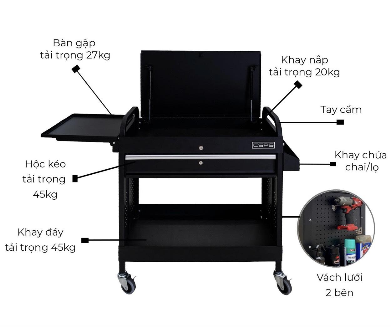 Tủ dụng cụ CSPS 7 ngăn kéo, mặt ván gỗ và vách lưới chất lượng cao. THÔNG SỐ KỸ THUẬT 1 THÔNG SỐ CHUNG Kích thước sản phẩm: 76.4 cm Ngang x 46.2cm Sâu x 96