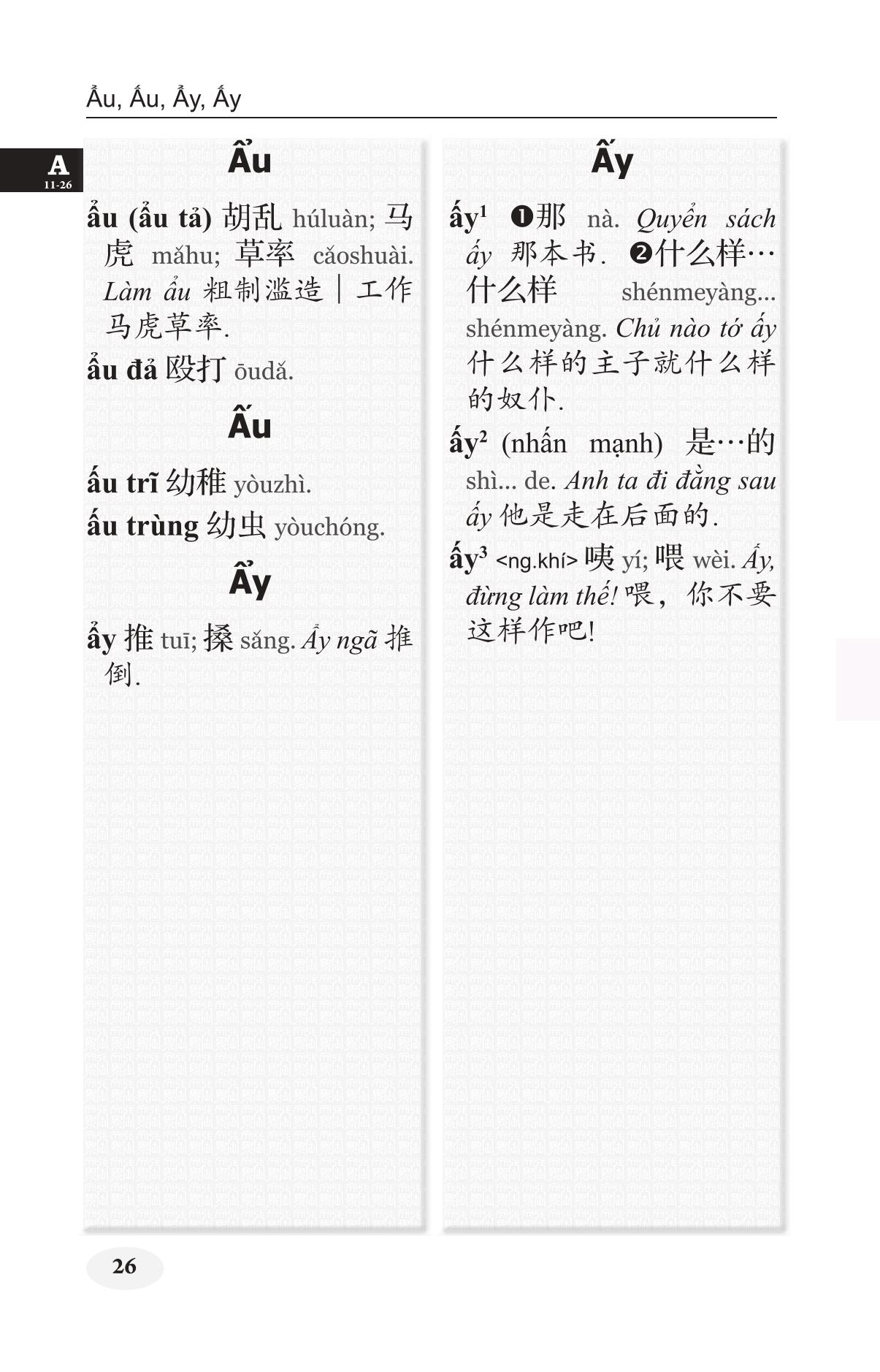 Khổ 10x16, bìa cứng, 1424 trang, in giấy trắng đẹp Nhằm đáp ứng nhu cầu tra cứu từ Việt sang Hán của người học tiếng Hán, nhất là để phục vụ cho đối tượng học