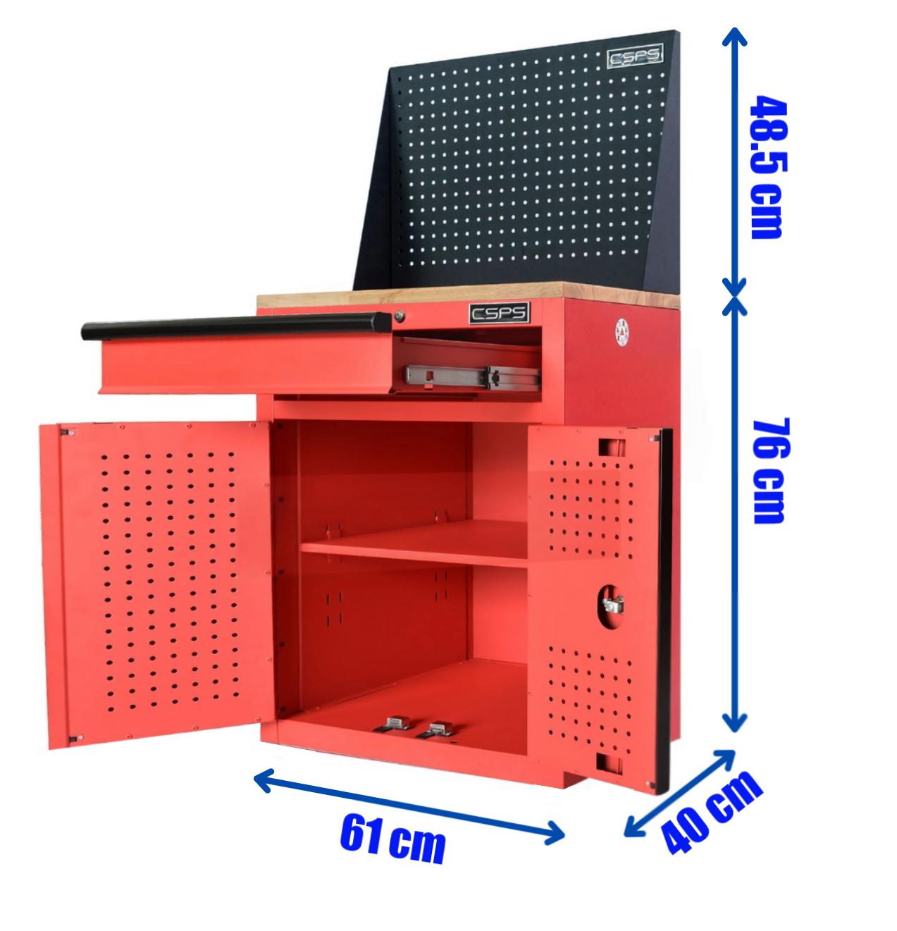 Tủ dụng cụ CSPS 61cm - 01 hộc kéo màu đỏ ván gỗ vách lưới 1.THÔNG SỐ CHUNG Kích thước đóng gói/ Package dimension: 62cm W x 43cm D x 78.5cm H Kích thước sản