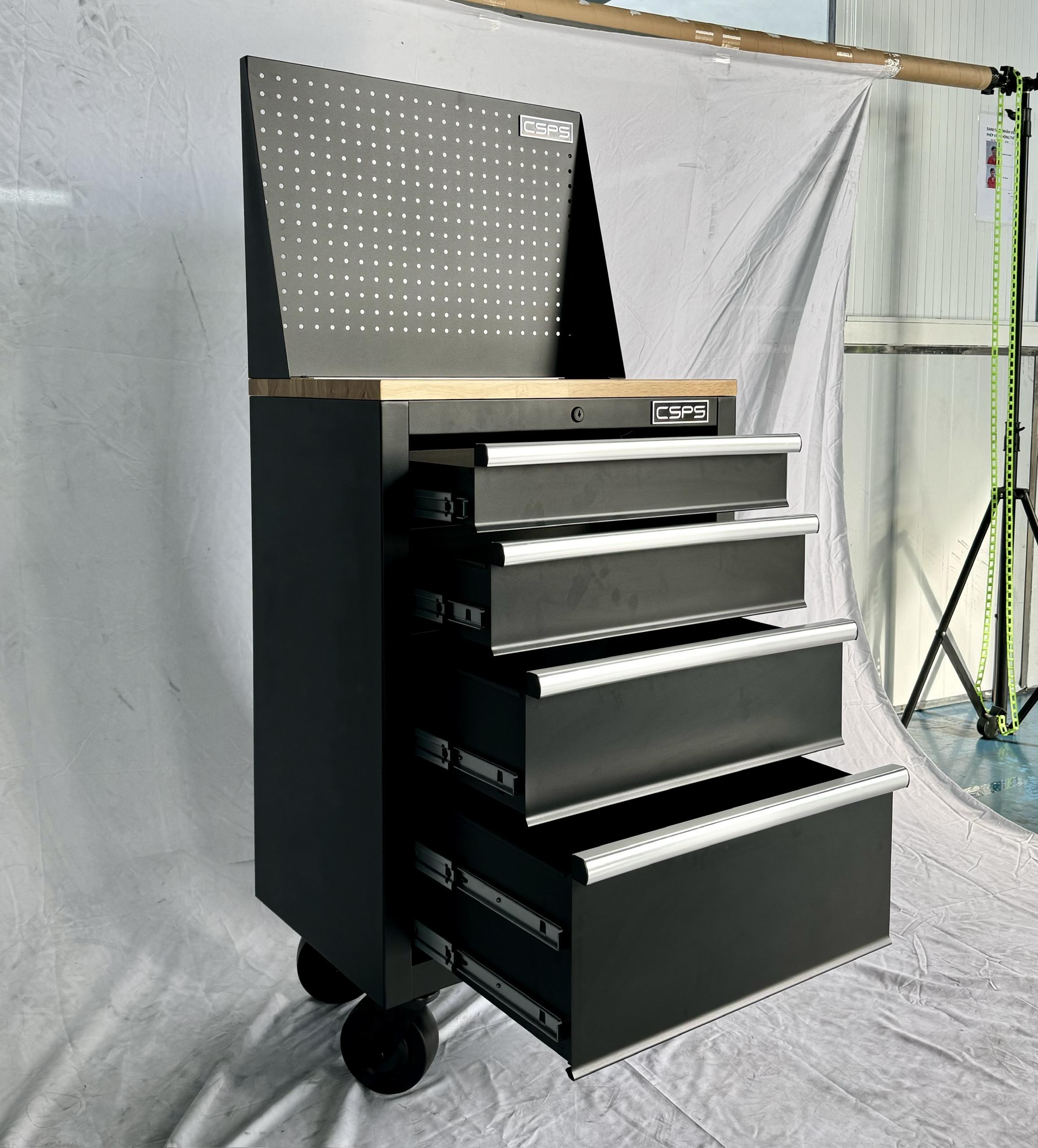Tủ dụng cụ CSPS 61cm - 04 hộc kéo màu đen bánh xe ván gỗ vách lưới (tay cầm trắng)