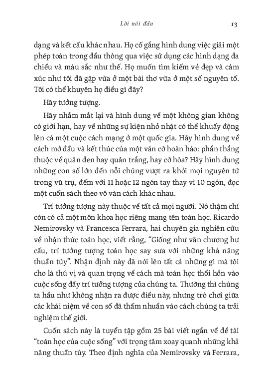 Với nguồn cảm hứng đa dạng, từ bông tuyết, mười một ngón tay của Anne Boleyn, cho đến gia đình đông anh em của mình, Tammet khám phá những câu hỏi như vì sao thời gian dường như trôi nhanh hơn khi chúng ta lớn tuổi hơn, liệu có tồn tại một thứ gọi là con người trung bình hay không, và làm sao để hiểu về những người mà chúng ta yêu quý. Cuốn sách mới đầy thú vị và nhiều sức gợi này sẽ làm thay đổi cách suy nghĩ của bạn về toán học và kích thích trí tưởng tượng của bạn để bạn có thể nhìn nhận thế giới bằng đôi mắt mới mẻ.