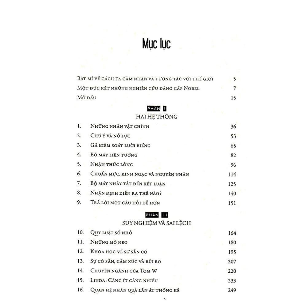 Mua tại TiktokTư Duy Nhanh Và Chậm Trong một loạt thí nghiệm tâm lý mang tính tiên phong, Kahneman và Tversky chứng minh rằng, con người chúng ta thường đi đến quyết định theo cơ chế nghĩ nhanh hơn là ghĩ chậm. Phần lớn nội dung của cuốn sách chỉ ra những sai lầm của con người khi suy nghĩ theo hệ thống 1. Kahneman chứng minh rằng chúng ta tệ hơn những gì chúng ta tưởng: đó là chúng ta không biết những gì chúng ta không biết! Cuốn sách đặc biệt đã dành được vô số giải thưởng danh giá: Sách khoa học hay nhất của Học viện Khoa học Quốc gia năm 2012, được tạp chí The New York Times bình chọn là sách hay nhất năm 2011, một trong những cuốn sách kinh tế xuất sắc năm 2011, chiến thắng giải thưởng cuốn sách được quan tâm nhất năm 2011 của tạp chí Los Algeles… Tư duy nhanh và chậm đáp ứng hai tiêu chí của một cuốn sách hay, thứ nhất nó thách thức quan điểm của người đọc, thứ hai, nó không phải là những trang sách với những con chữ khô cứng mà nó vô cùng vui nhộn và hấp dẫn. Không nghi ngờ gì nữa, đây là cuốn sách hàn lâm dành cho tất cả mọi người!