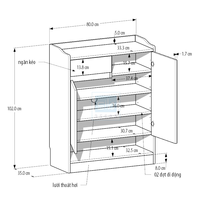 - Kích thước: 80 x 35 x 102cm (Dài x Rộng x Cao).
