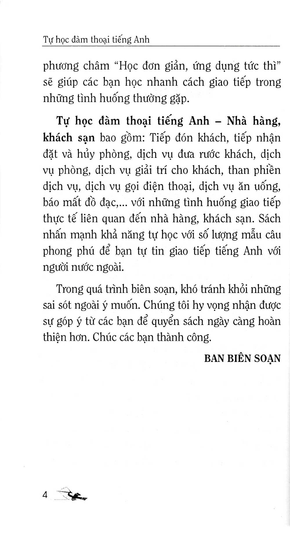 Cuốn sách Tự Học Đàm Thoại Tiếng Anh Nhà Hàng - Khách Sạn là một tài liệu hữu ích dành cho những ai đam mê ngành nhà hàng và khách sạn. Với nội dung được thiết kế đặc biệt cho các chuyên ngành này, sách cung cấp cho độc giả những kỹ năng cần thiết để giao tiếp hiệu quả trong môi trường làm việc quốc tế.