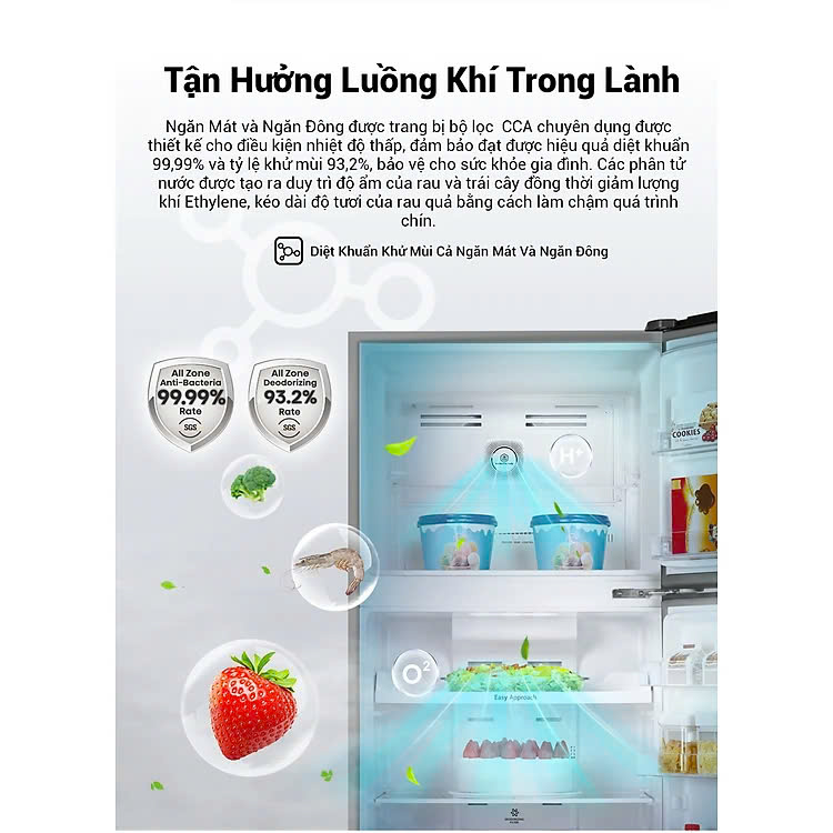 - Diệt Khuẩn Khử Mùi Cả Ngăn Mát Và Ngăn Đông, Tận Hưởng Luồng Khí Trong Lành: Ngăn Mát và Ngăn Đông được trang bị bộ lọc CCA chuyên dụng được thiết kế cho điều kiện nhiệt độ thấp, đảm bảo đạt được hiệu quả diệt khuẩn 99,99% và tỷ lệ khử mùi 93,2%, bảo vệ cho sức khỏe gia đình. Các phân tử nước được tạo ra duy trì độ ẩm của rau và trái cây đồng thời giảm lượng khí Ethylene, kéo dài độ tươi của rau quả bằng cách làm chậm quá trình chín. Ngăn Cân Bằng Độ Ẩm,Tạm Biệt Nỗi Lo Ẩm Mốc: Moisture Fresh Crisper là ngăn đựng rau quả có hệ thống điều chỉnh độ ẩm, qua đó bạn có thể điều chỉnh độ ẩm để đáp ứng các yêu cầu bảo quản thực phẩm khác nhau. Độ ẩm thích hợp có thể giúp bảo quản thực phẩm lâu hơn.