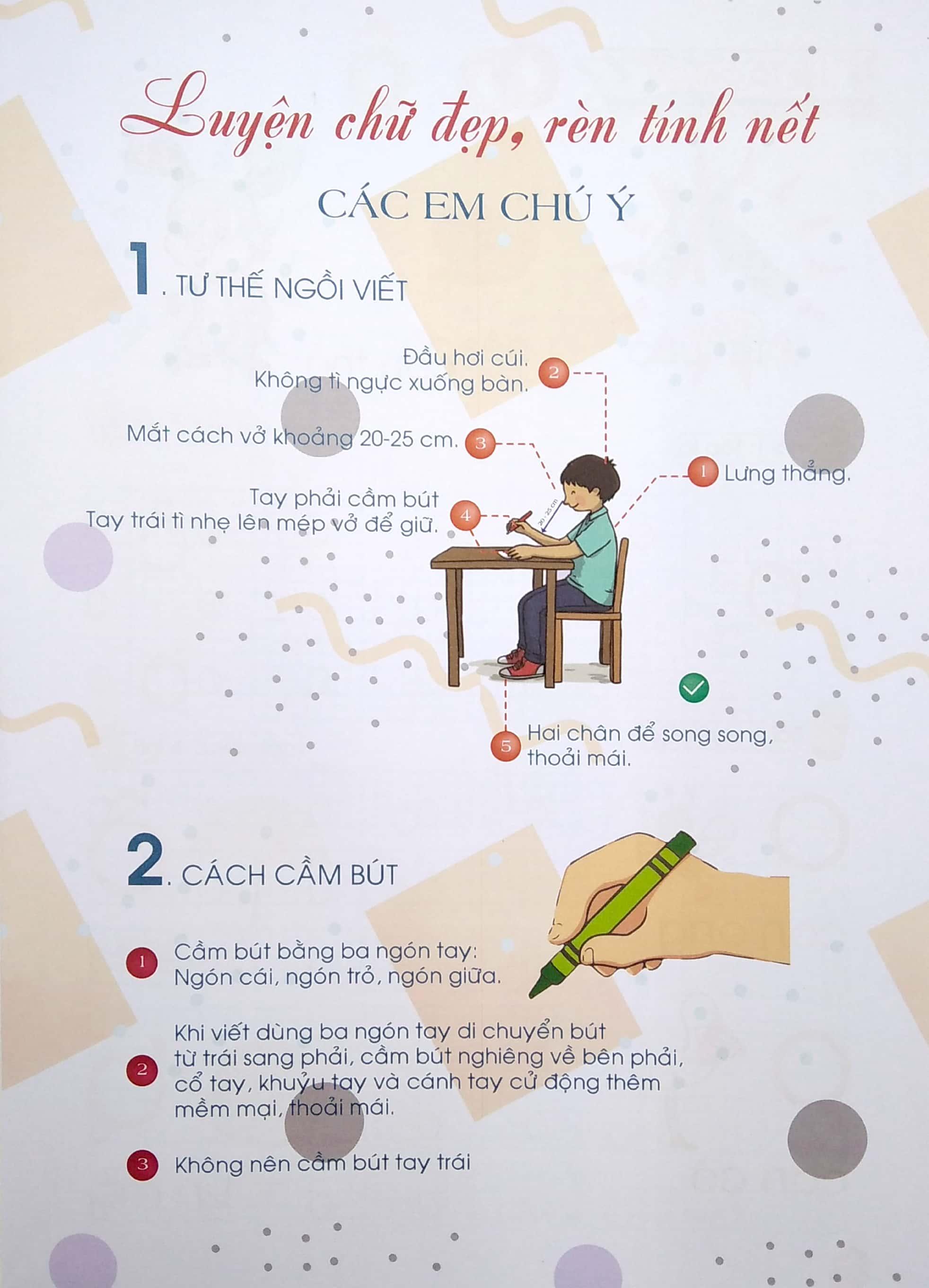 Cầm bút bằng ba ngón tay. Ngón cái, ngón trỏ, ngón giữa.