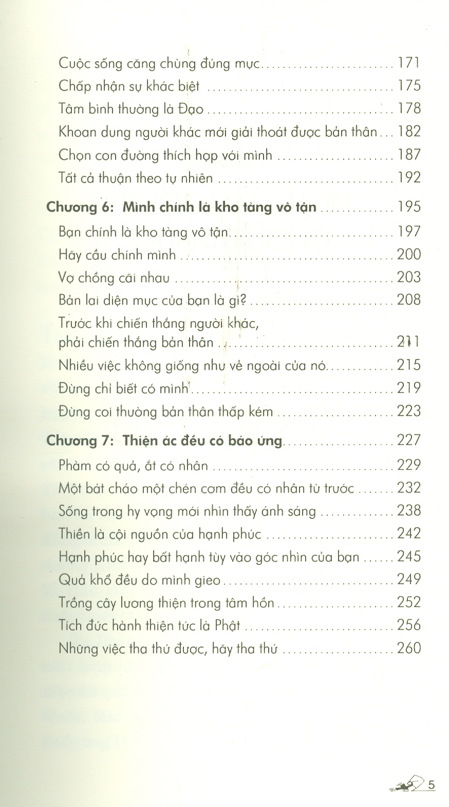 Cuộc sống quanh ta đầy màu nhiệm, chánh niệm là trái tim của thiền tập, là nguồn năng lượng xuyên suốt không thể thay đổi. Một người sống trong chánh niệm, tâm an, sẽ khiến những người xung quanh vui vẻ, an nhiên và thậm chí thay đổi cả xã hội. “Tất cả chúng ta đều có hạt giống của niệm và định” “Định làm phát sinh hỷ lạc” Định nguồn căn, có định con người sẽ cảm thấy đang thực sự sống chứ không phải chỉ tồn tại. Cảm nhận cuộc đời tươi đẹp không qua đôi mắt mà qua hơi thở và tâm hồn. Thiền sư Lâm Tế đã nói rằng: “Phép lạ là đi trên mặt đất mà không phải đi trên mặt nước hay đi trên than hồng”. Tất cả những gì ta làm đều cốt yếu là để tâm an. Mỗi ngày, ta đì tìm tự do cho hạnh phúc, hay hạnh phúc để được tự do?! Nếu cứ mải mê mắc kẹt trong quá khứ và lo buồn về tương lai, hiện tại sẽ tự nhiên ngả màu héo úa. Nghỉ ngơi là bước đầu tiên của thiền tập, và con đường ngắn nhất là thả lỏng và không gượng ép. Sống là để không uổng phí một đời, sống trọn vẹn từng giây phút, thanh thản từng hành động. Bước đi một cách thoải mái, an lạc, đi như không đi sẽ không thấy mệt mỏi. Sự cố gượng là không cần thiết nếu ta hiểu được rằng mỗi bước đi là mỗi bước được tiếp xúc với cuộc đời và sự màu nhiệm vô tận. Chạm vào đất Mẹ là nguồn căn của “Sám Pháp địa xúc”, người thường cũng có thể thực hành khi bế tắc, lo sợ, Người nhẫn nại bảo hộ, che chở và cho ta lối thoát, mọi thứ tự khắc trở nên nhẹ nhàng. Cuốn sách tiếp tục với Năm uẩn trong một con người: sắc, thọ, tưởng, hành, thức, đều cần trị vì, cai quản. Có chánh niệm sẽ nhận diện được