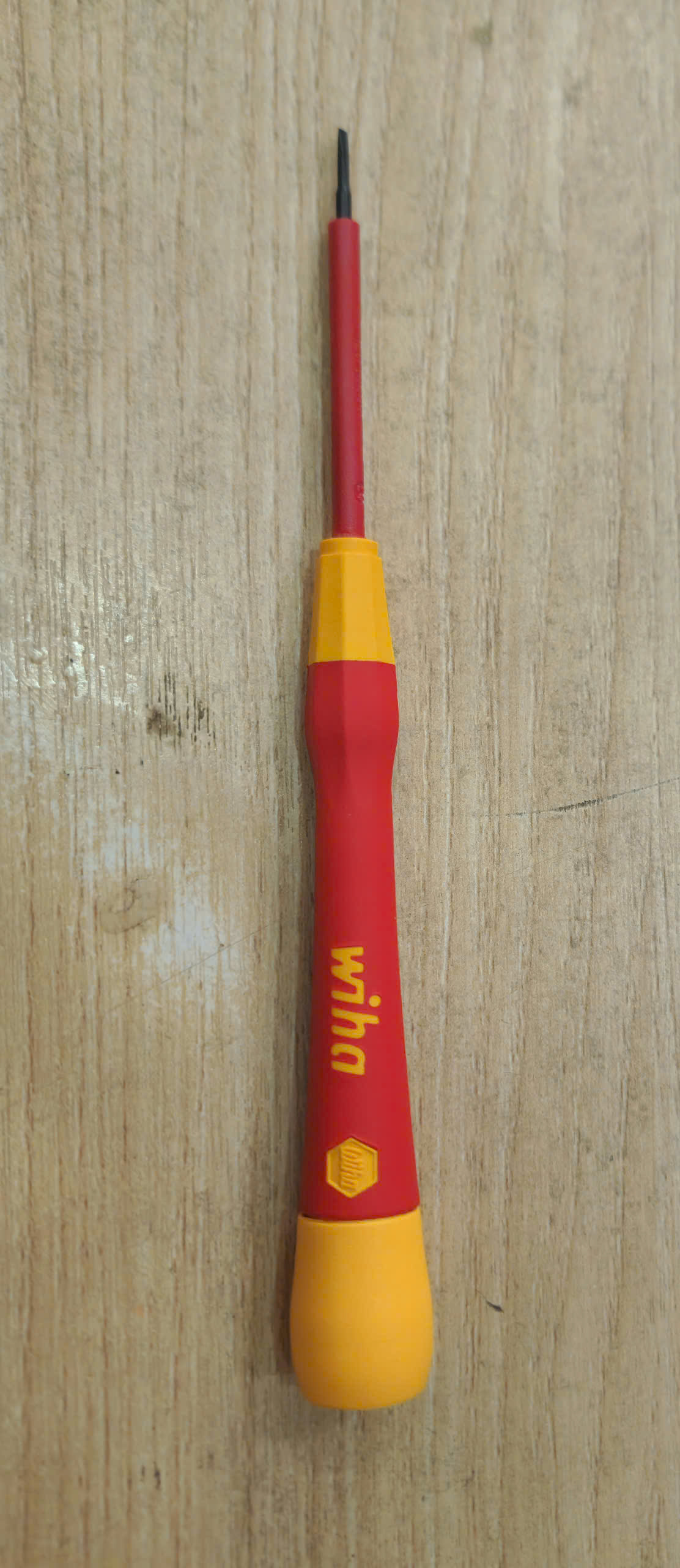 English name:Screwdriver SoftFinish electric Tiêu chuẩnĐược thử nghiệm theo IEC 60900.Ứng dụng Đối với công việc trong khu vực của các bộ phận sống lên đến 1.000 V AC. Size: 2,5 mm Chiều dài: 179