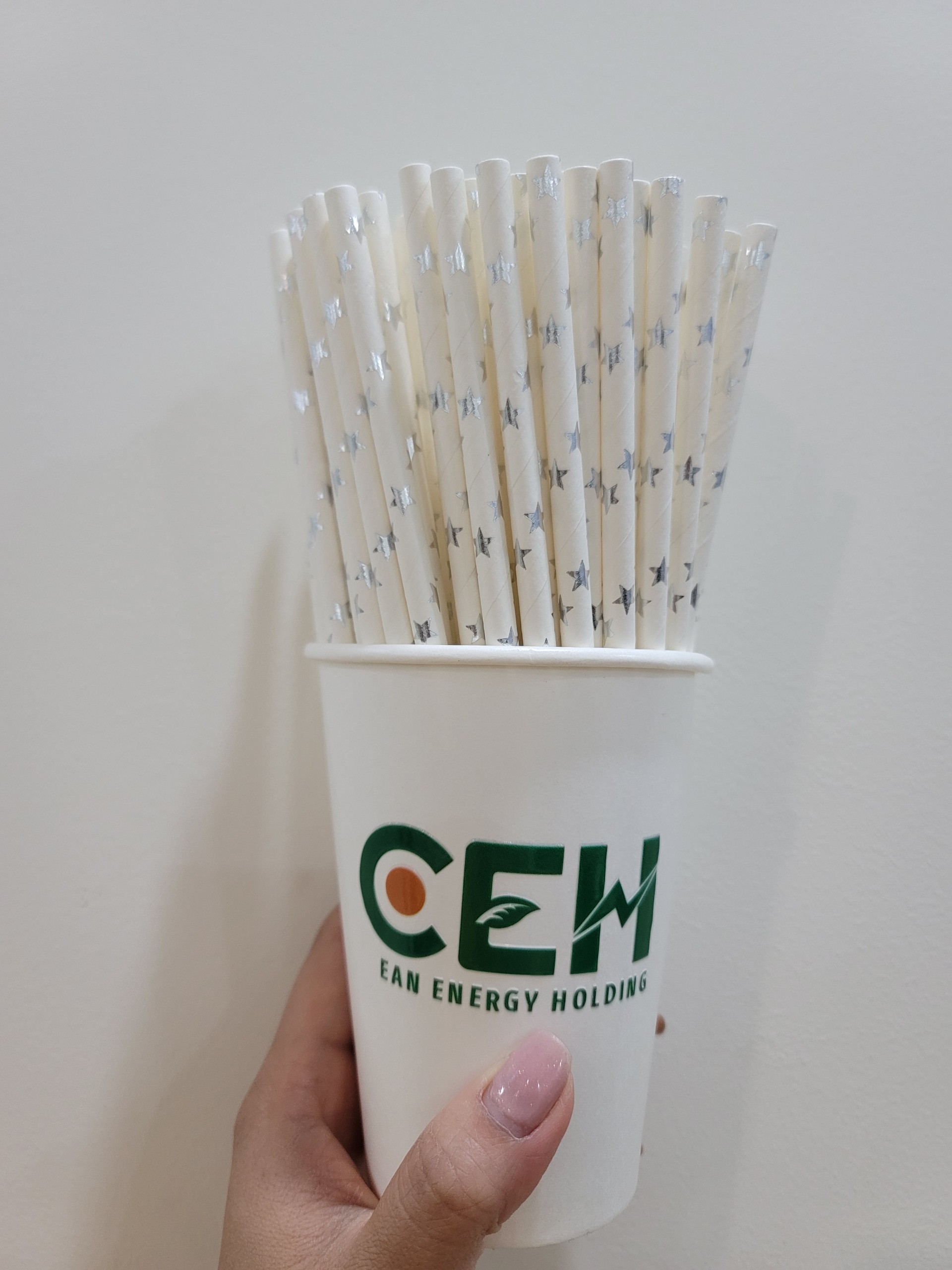 Sản phẩm của công ty Clean Energy Holding Ống hút giấy thân thiện với môi trường, kích thước 12mm x 197mm, phù hợp sử dụng cho các loại đồ uống như trà sữa, sinh tố,