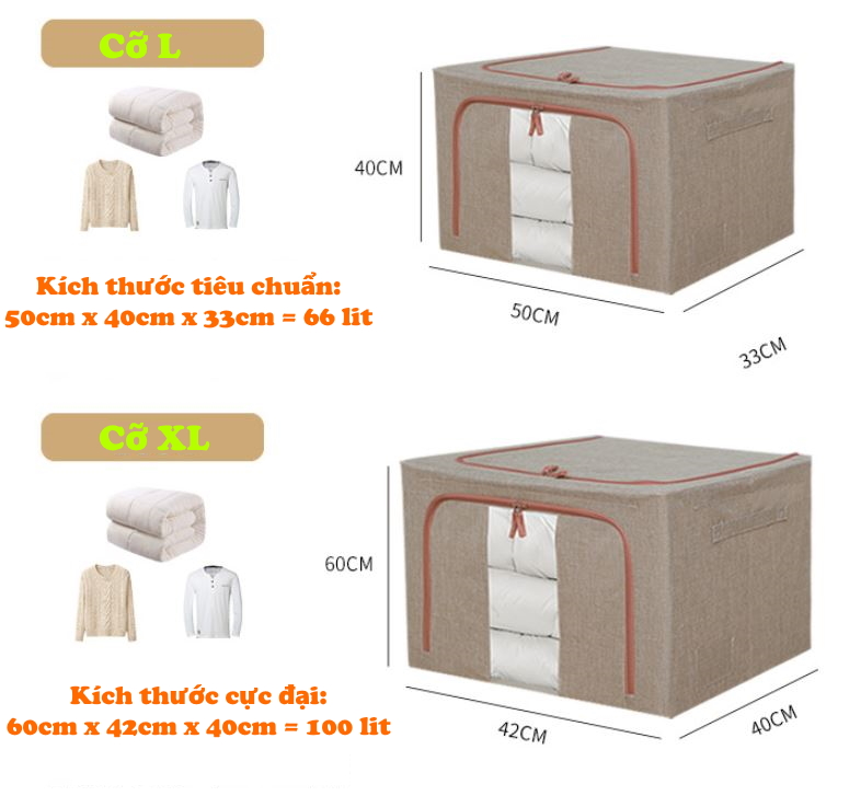 - Size L (Kích thước tiêu chuẩn) 50cm x 40cm x 33cm, dung tích 66 lit. Trọng lượng: 1,4kg, tháo xẹp khi đóng gói dày 4cm. Tải trọng tối đa 40kg