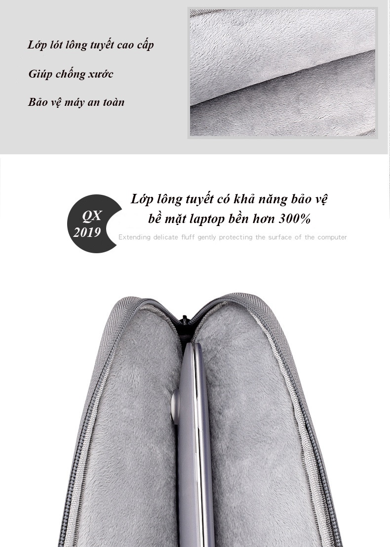 Bên trong là lớp lót lông tuyết êm ái siêu mịn. Bạn có thể lấy máy ra vào trường xuyên mà ko bị trầy xước. Tăng độ bền bề mặt laptop lên 300% nhất là những dòng máy cao cấp như Mac book.