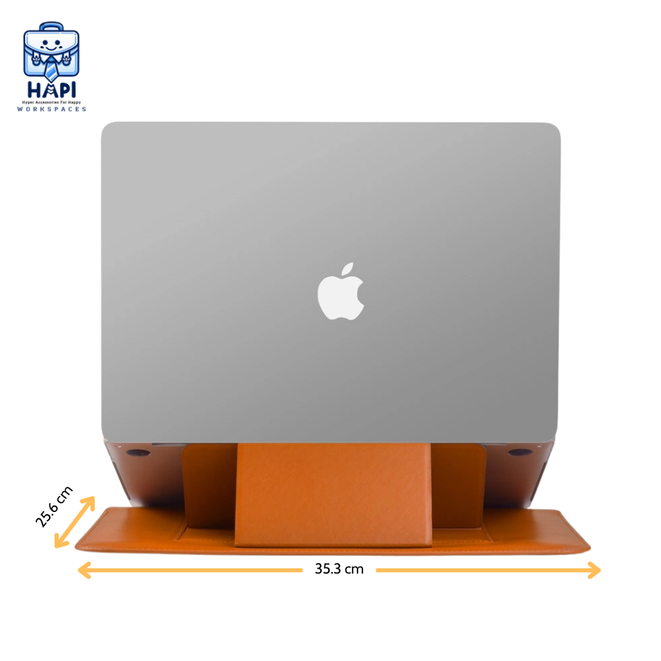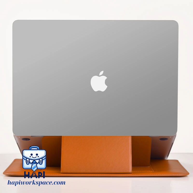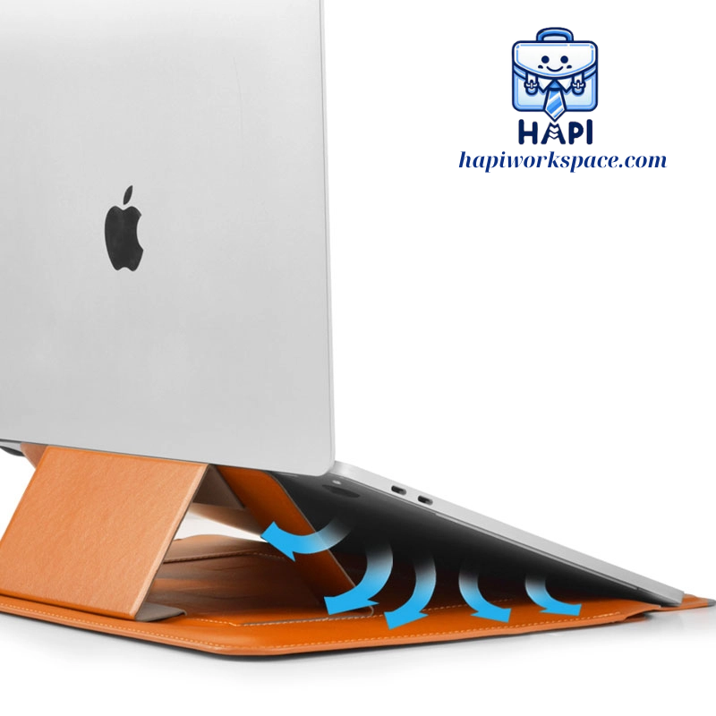 Thiết kế tích hợp chức năng kê laptop giúp tạo góc độ công thái học làm giảm áp lực khi sử dụng trong thời gian dài Chất liệu da PU chống thấm nước giúp laptop