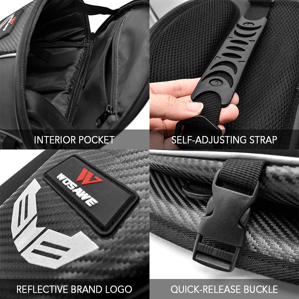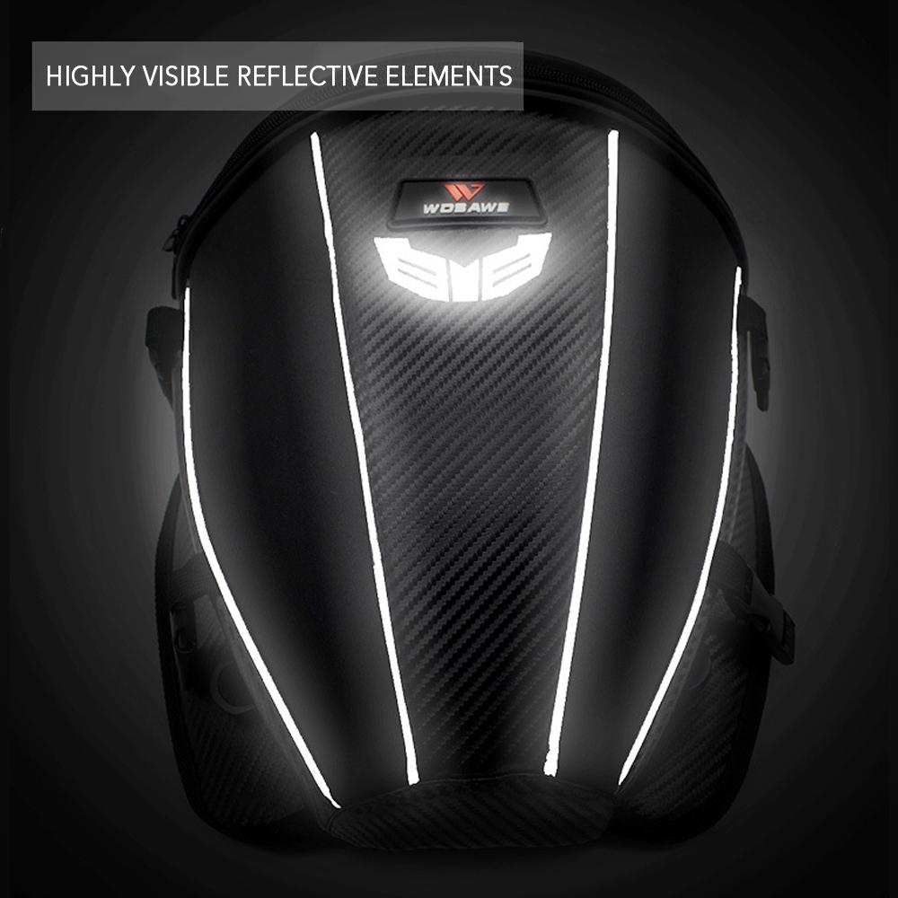 Made with high-quality polyester and PU material, this bag is water-resistant and wear-resistant. It features highly visible reflective piping, and self-adjusting buckle for easy mounting on the rear seat of your motorcycle. With 15L capacity,