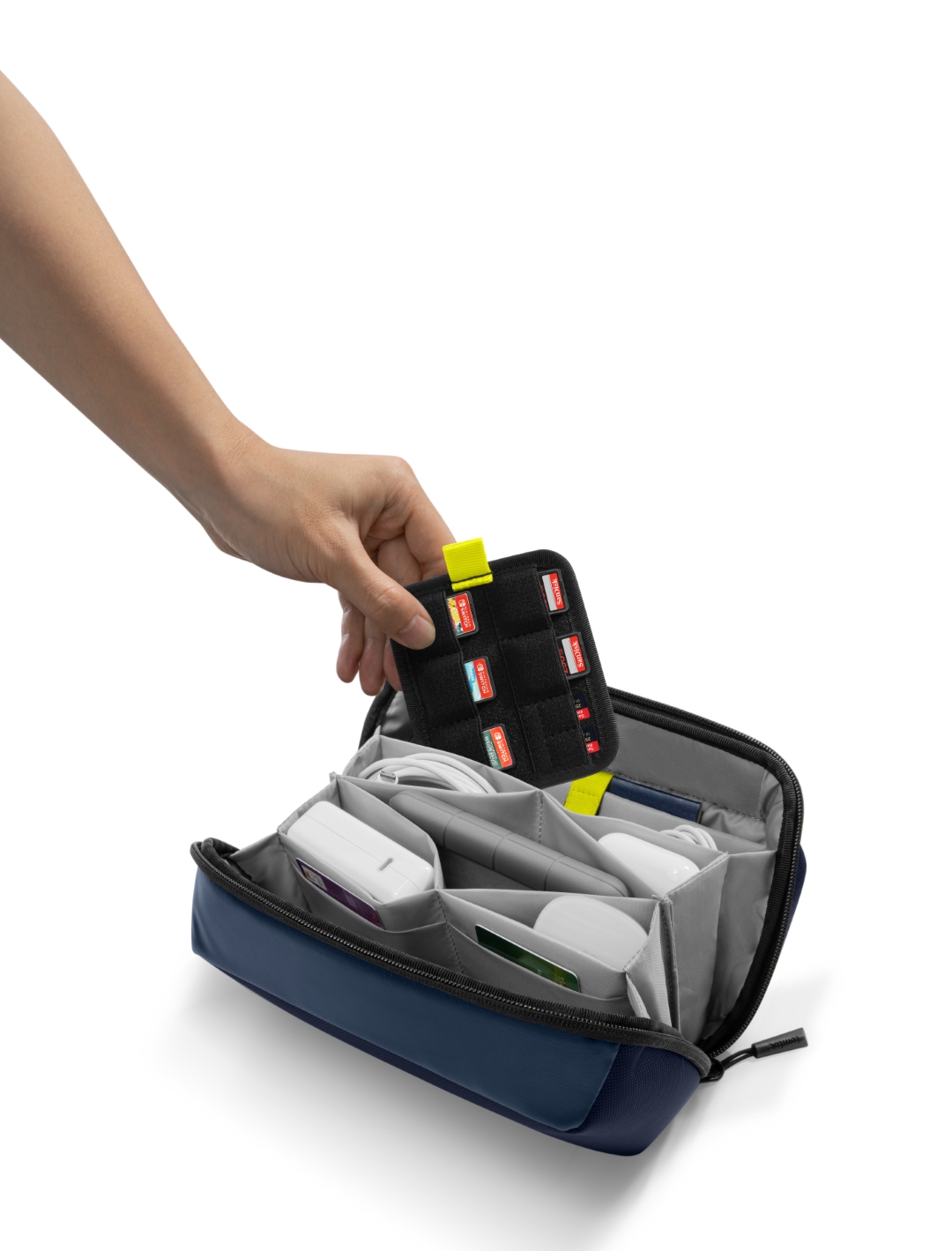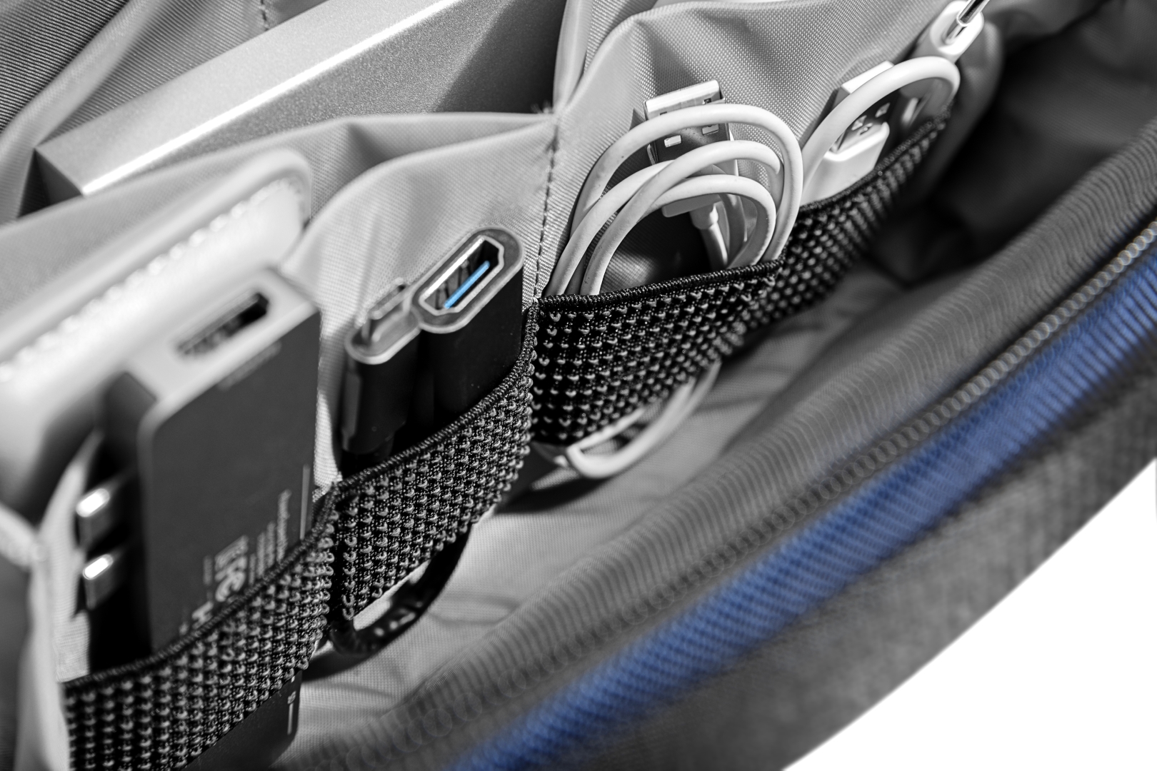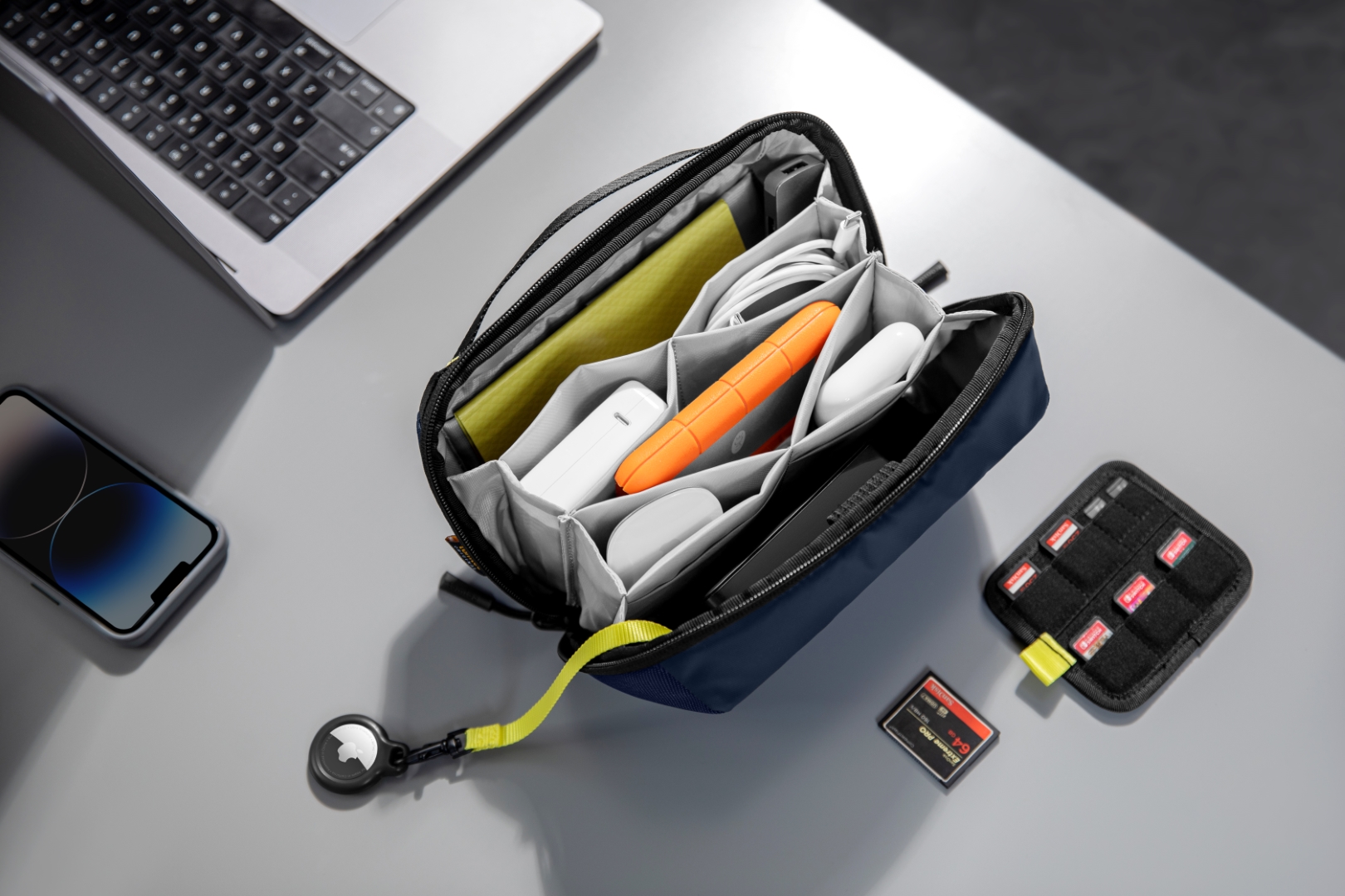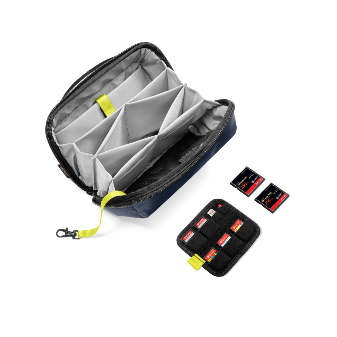 Túi đựng phụ kiện này có tổng cộng 13 ngăn để đựng cáp, đồ dùng hàng ngày hoặc vật dụng cần thiết khi đi du lịch, giúp đồ đạc của bạn được sắp xếp gọn gàng và dễ tìm. Một số vòng dây đeo phụ kiện không trơn bằng thun giữ cho các vật dụng như bút và pin luôn trong tầm tay. Một tấm ngăn có thể tháo rời với một số khe cắm thẻ cho thẻ SD, thiết bị chuyển đổi USB, v.v.