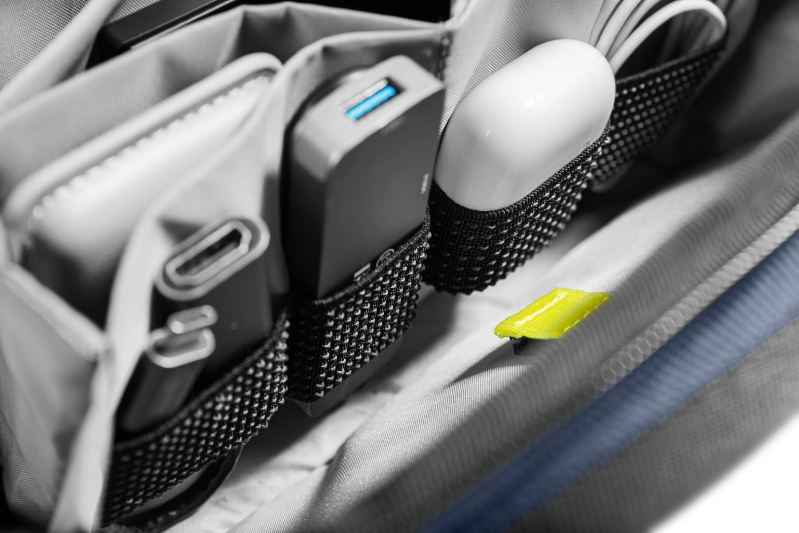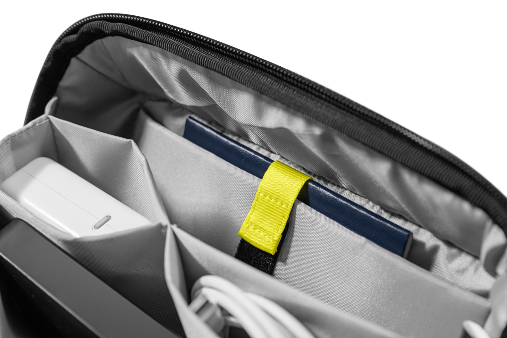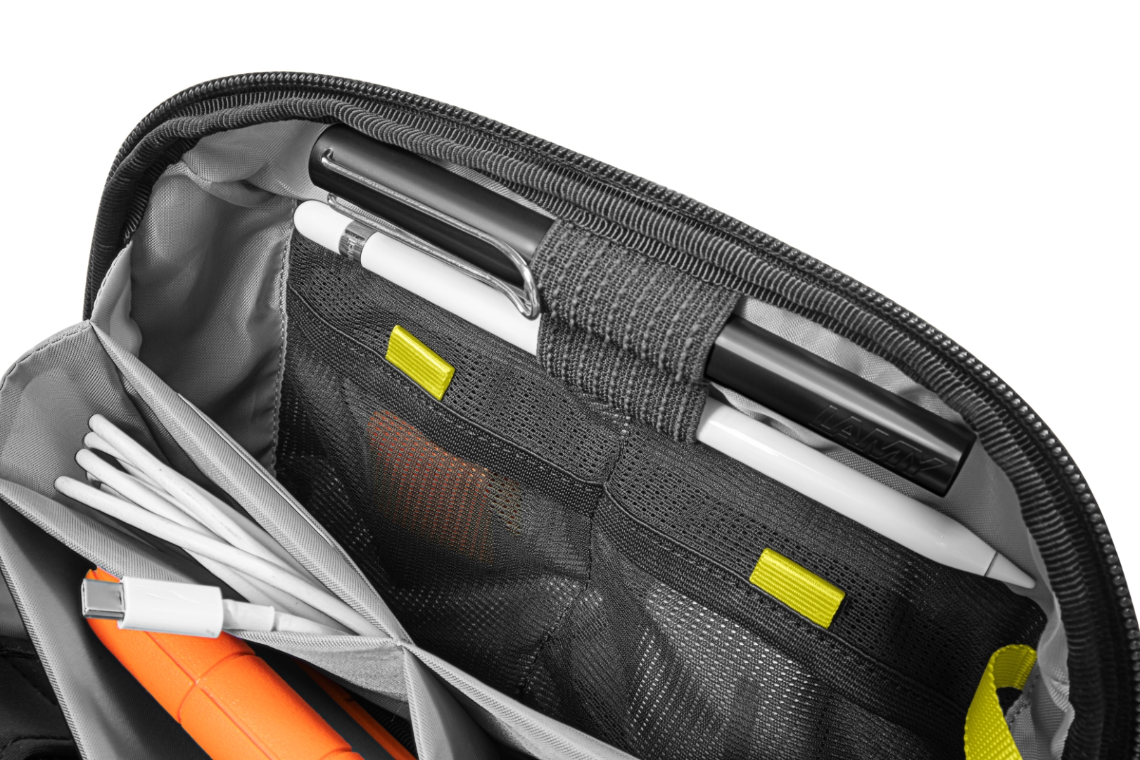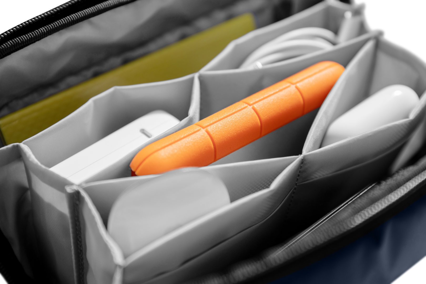 Túi đựng phụ kiện này có tổng cộng 13 ngăn để đựng cáp, đồ dùng hàng ngày hoặc vật dụng cần thiết khi đi du lịch, giúp đồ đạc của bạn được sắp xếp gọn gàng và dễ tìm. Một số vòng dây đeo phụ kiện không trơn bằng thun giữ cho các vật dụng như bút và pin luôn trong tầm tay. Một tấm ngăn có thể tháo rời với một số khe cắm thẻ cho thẻ SD, thiết bị chuyển đổi USB, v.v.