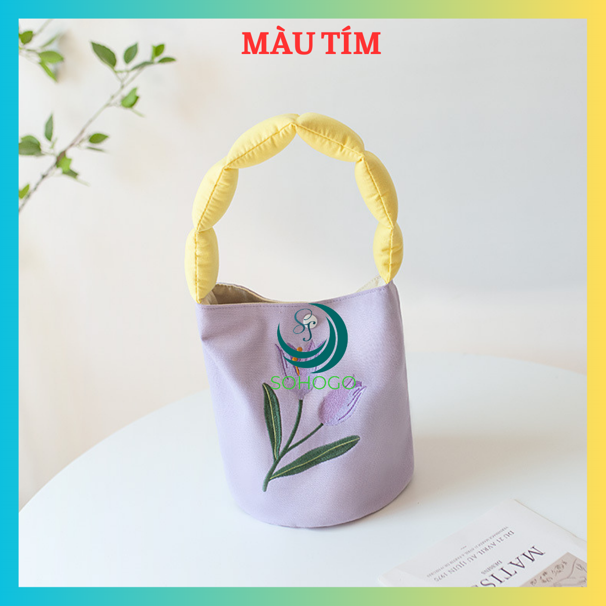 ✨Túi tote nữ, họa tiết hoa Tulip handmade vintage 24x18x18cm - Túi xách canvas hình hoa phong cách Hàn Quốc thanh lịch
